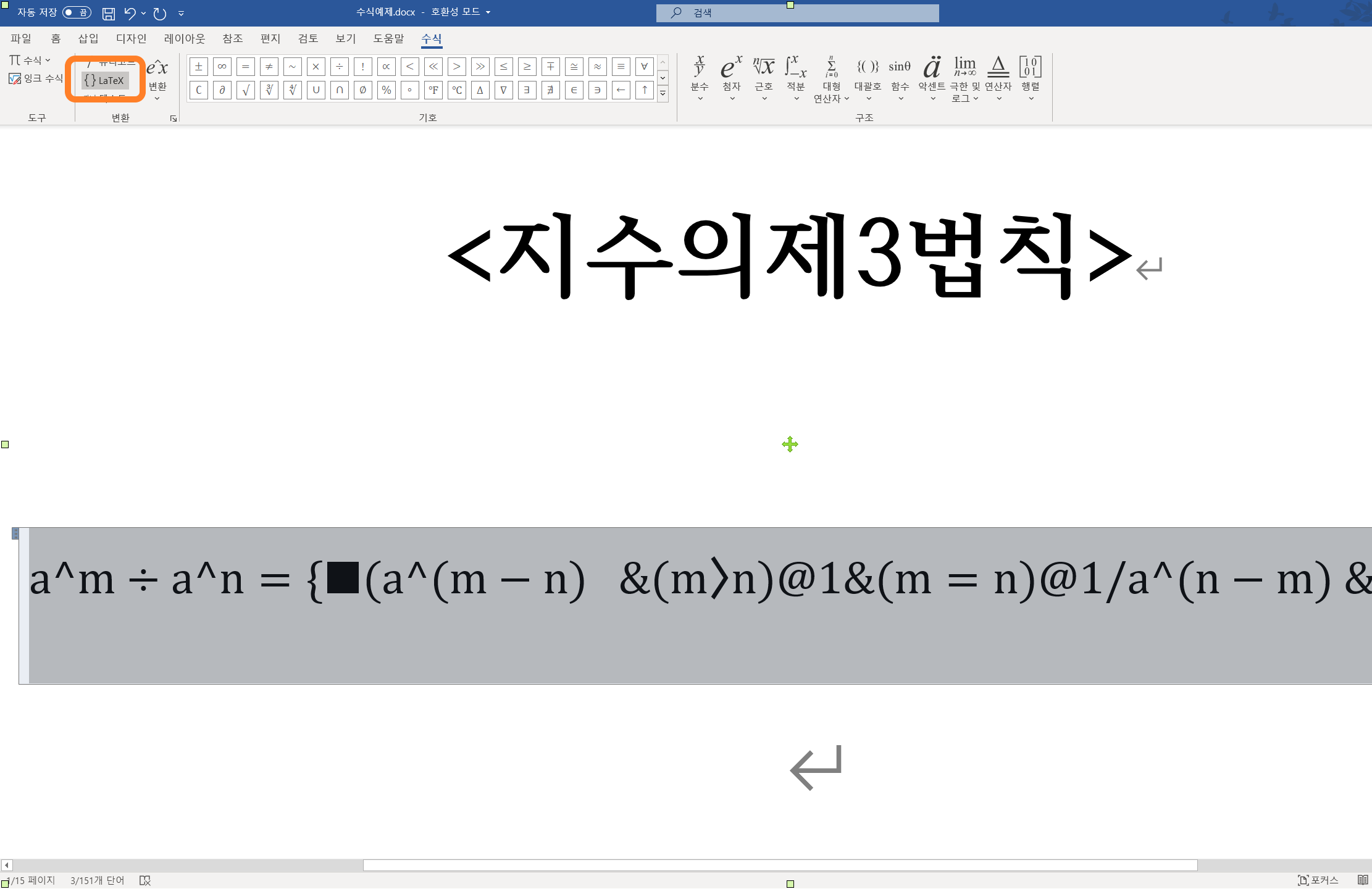 참고로 수식이 들어가 있는 한/글 문서를 MS워드파일로 저장하고 MS워드 안에서 수식을 선택한 후 레이텍버튼을 클릭하면 레이텍 문자열이 문서 안에 나타난다. 워드로 변환 후 LaTeX를 추출하는 방법이 가장 정확도가 높은 것으로 판단된다.