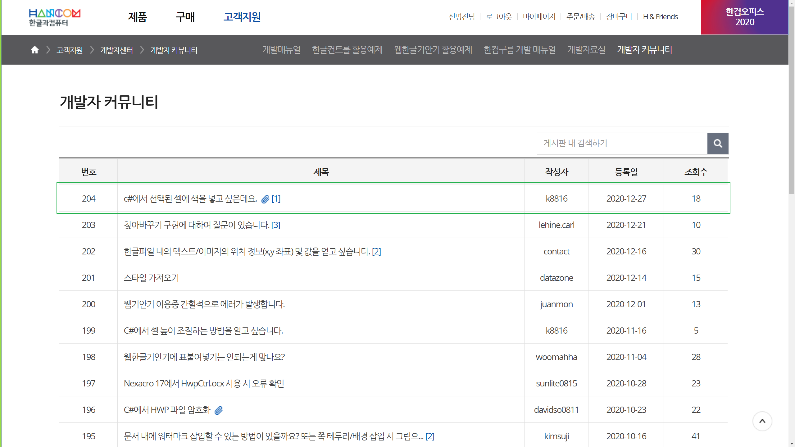 개발자 커뮤니티는 아래아한글 정품유저에 한해, 공개된 질의응답 및 노하우 공유 게시판이다. 예전에는 한컴 개발자 분이 직접 들르셔서 개발진 입장에서 상세한 답변을 거의 모든 질문에 남겨주셨는데, 현재는 유저끼리 종종 질답을 남기는 아주 소소한 게시판이 되었다..