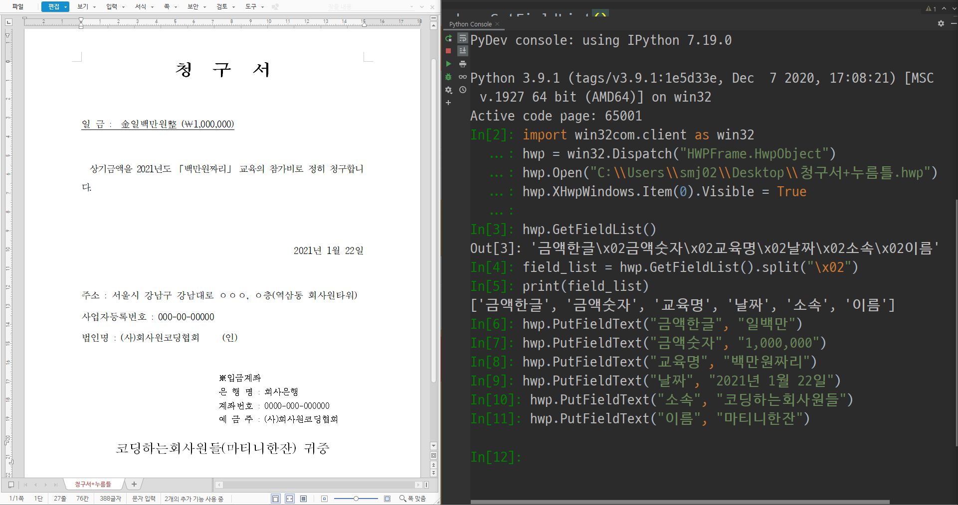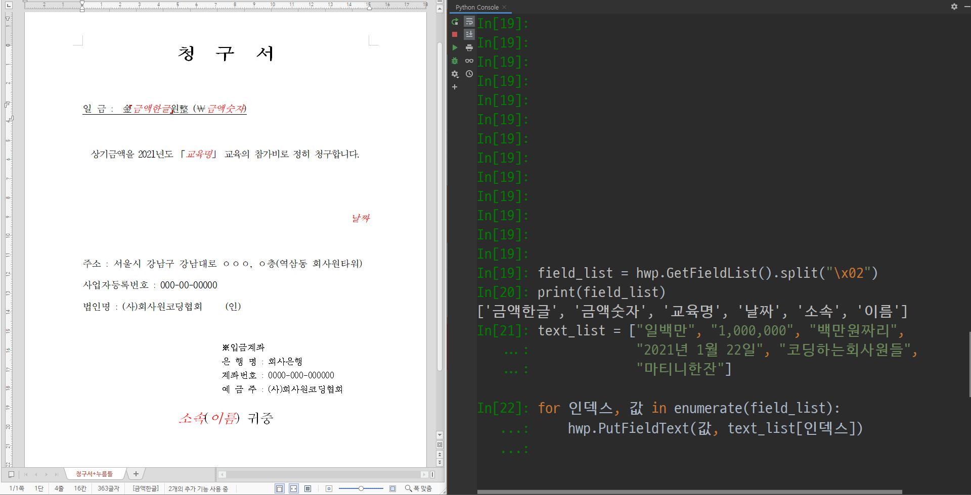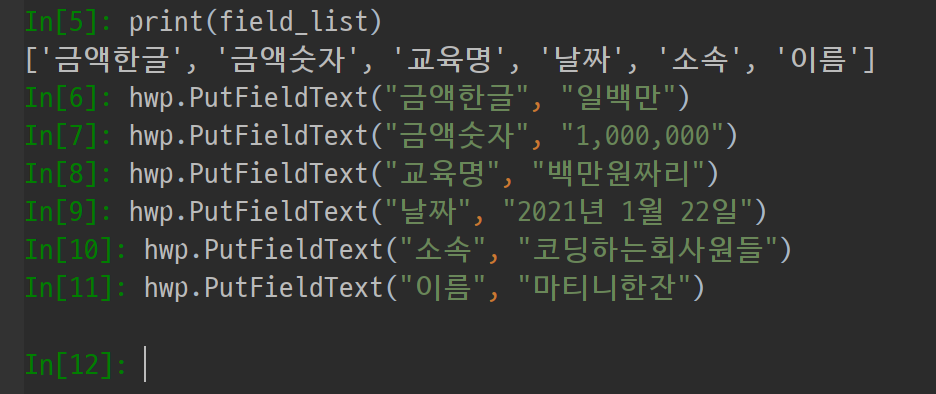3. 파이썬으로 문서 누름틀에 값을 넣어보자.