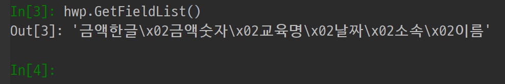 아래 콘솔창에 hwp.GetFieldList()를 입력하고 엔터를 치면,