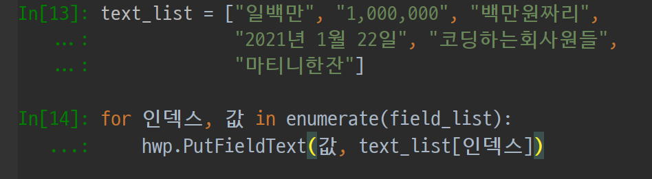 hwp.PutFieldText(Field="금액한글", Text="일백만")