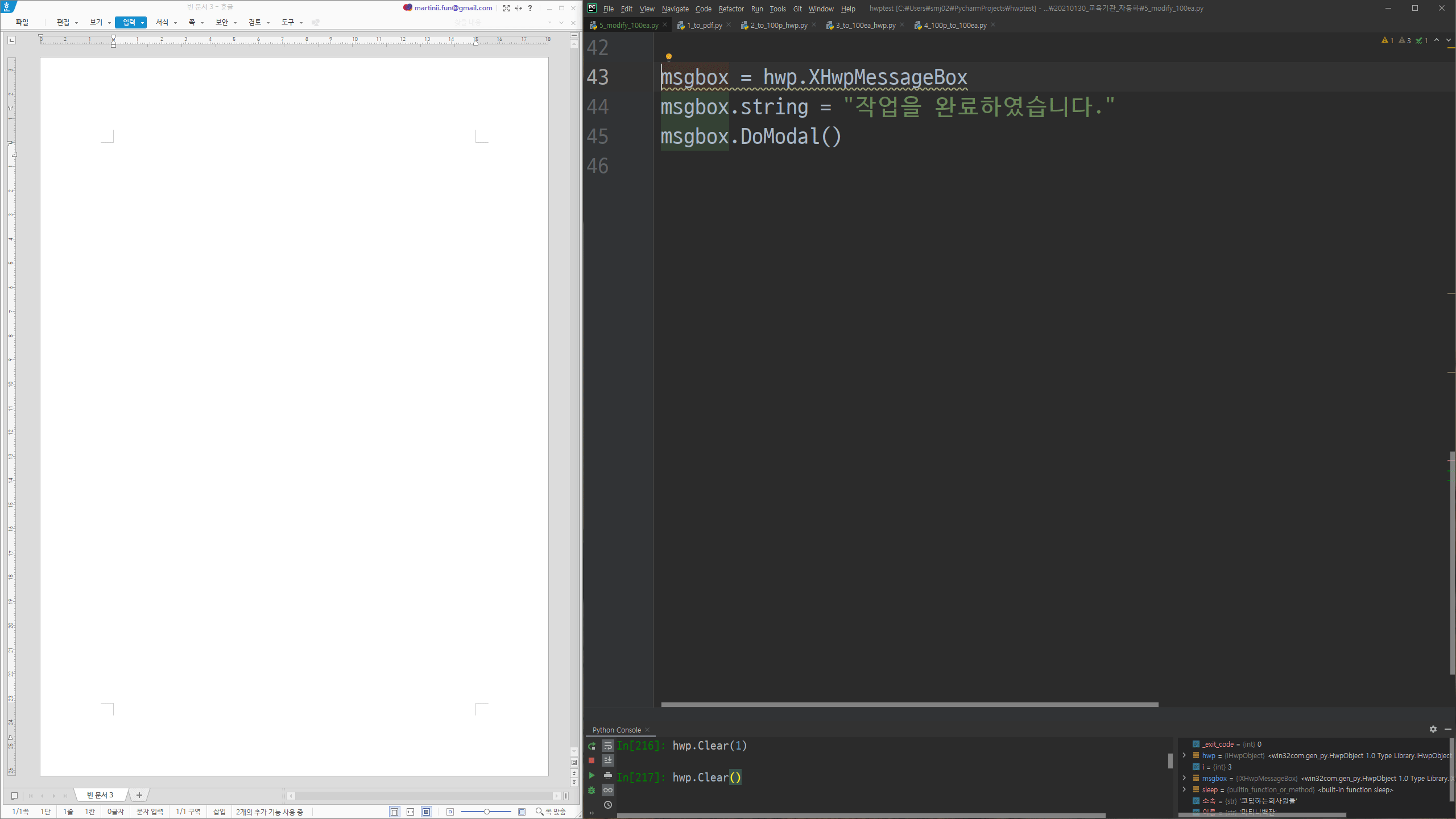 hwp = win32.gencache.EnsureDispatch("HWPFrame.HwpObject") # 한/글 프로그램 실행