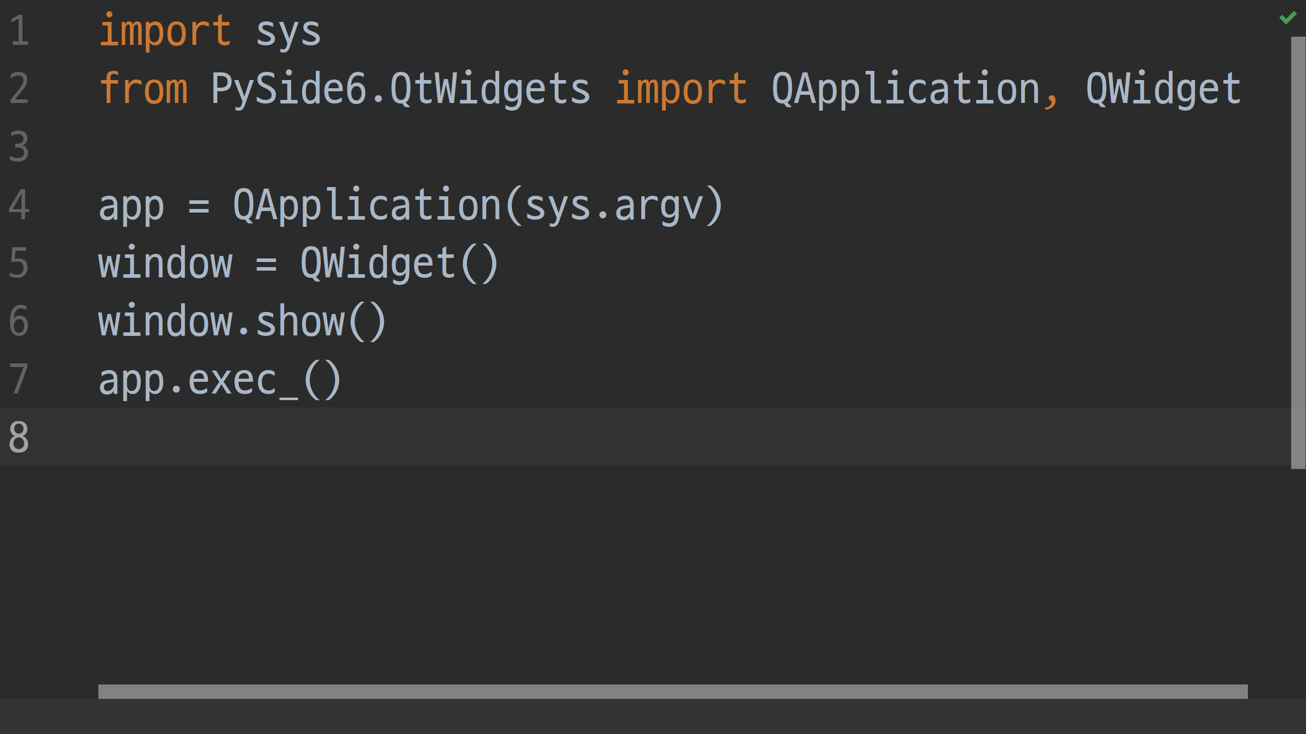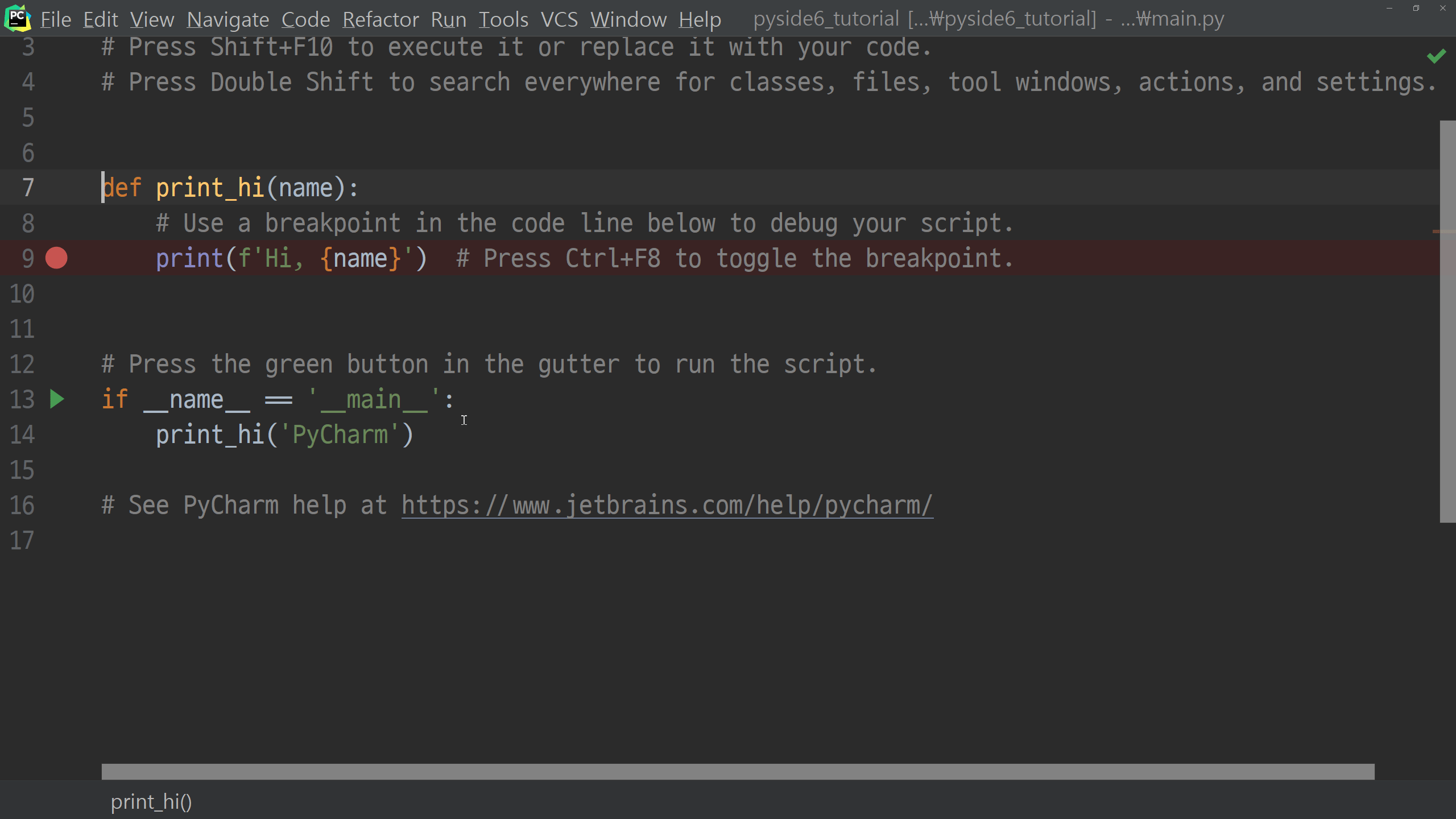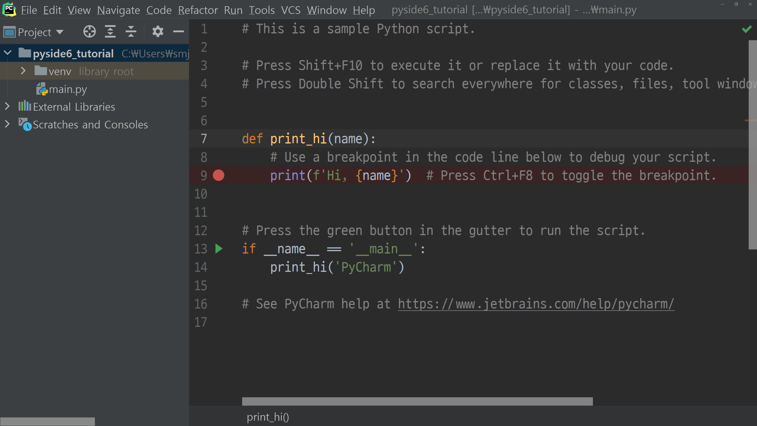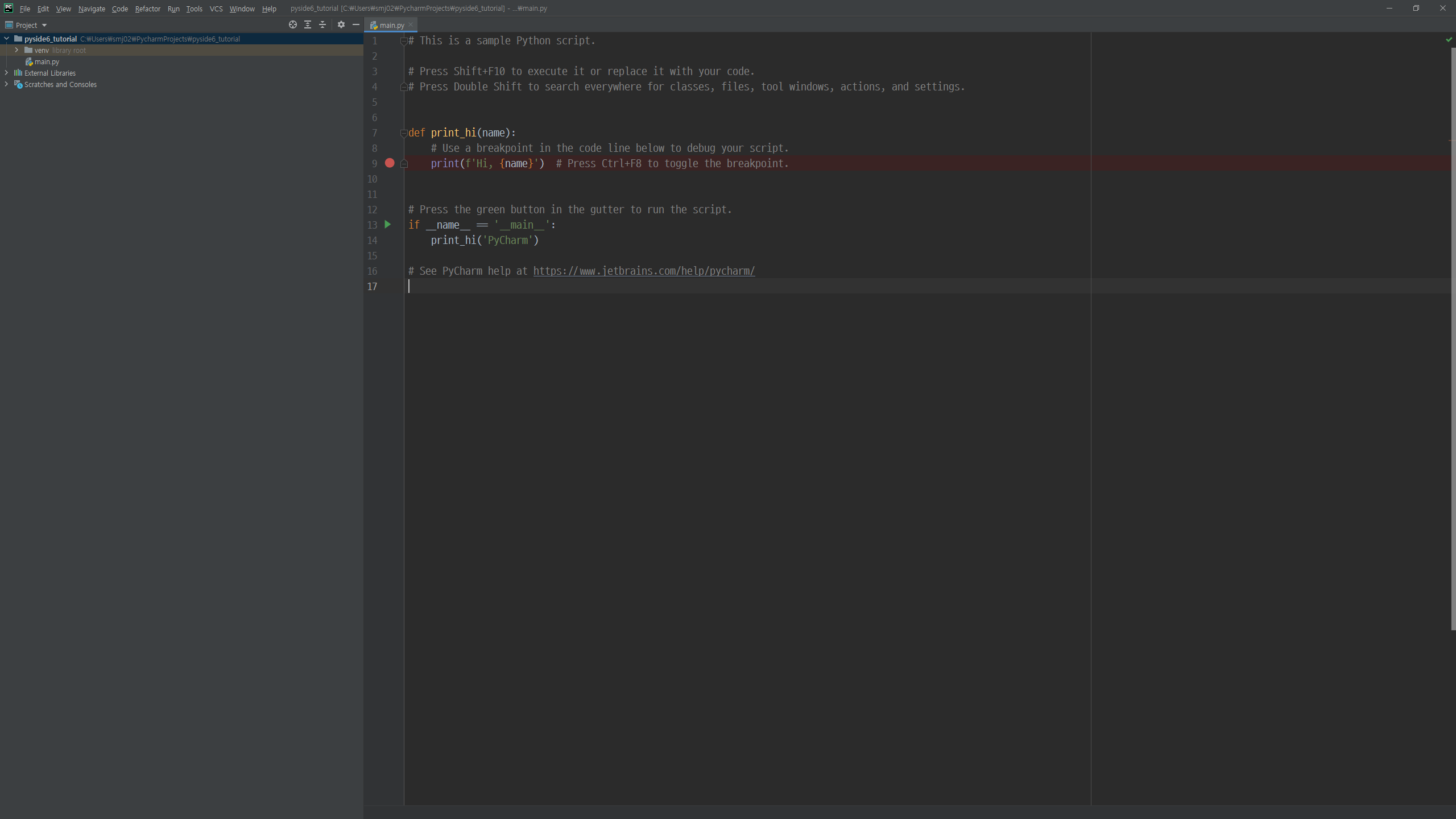 이제 PySide6의 설치를 마쳤으니 샘플코드를 한 번 실행해보고 이번 포스팅을 마칠 예정입니다. 프로젝트 루트의 main.py의 내용을 모두 지우고 아래처럼 입력해 주시기 바랍니다.
