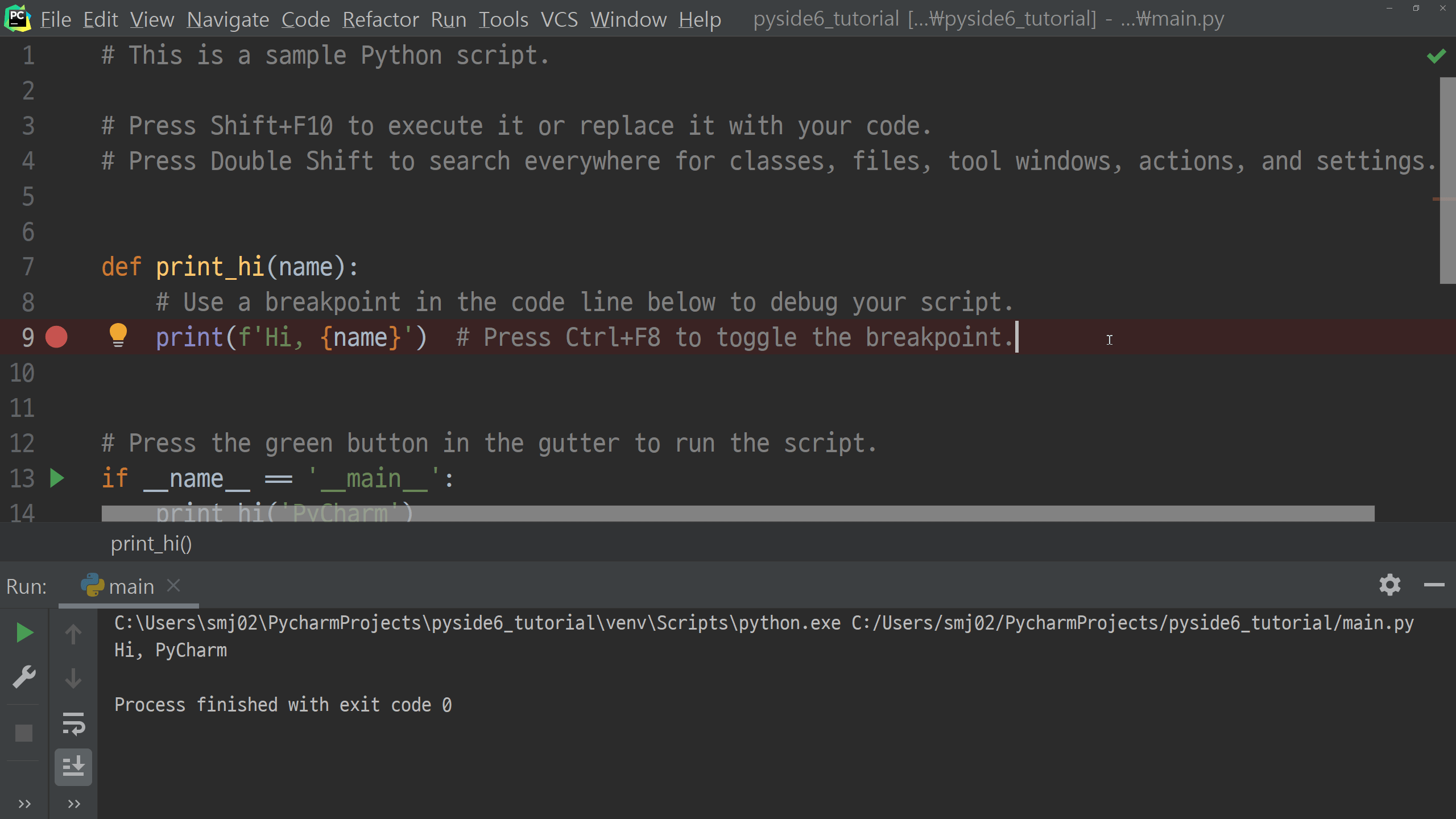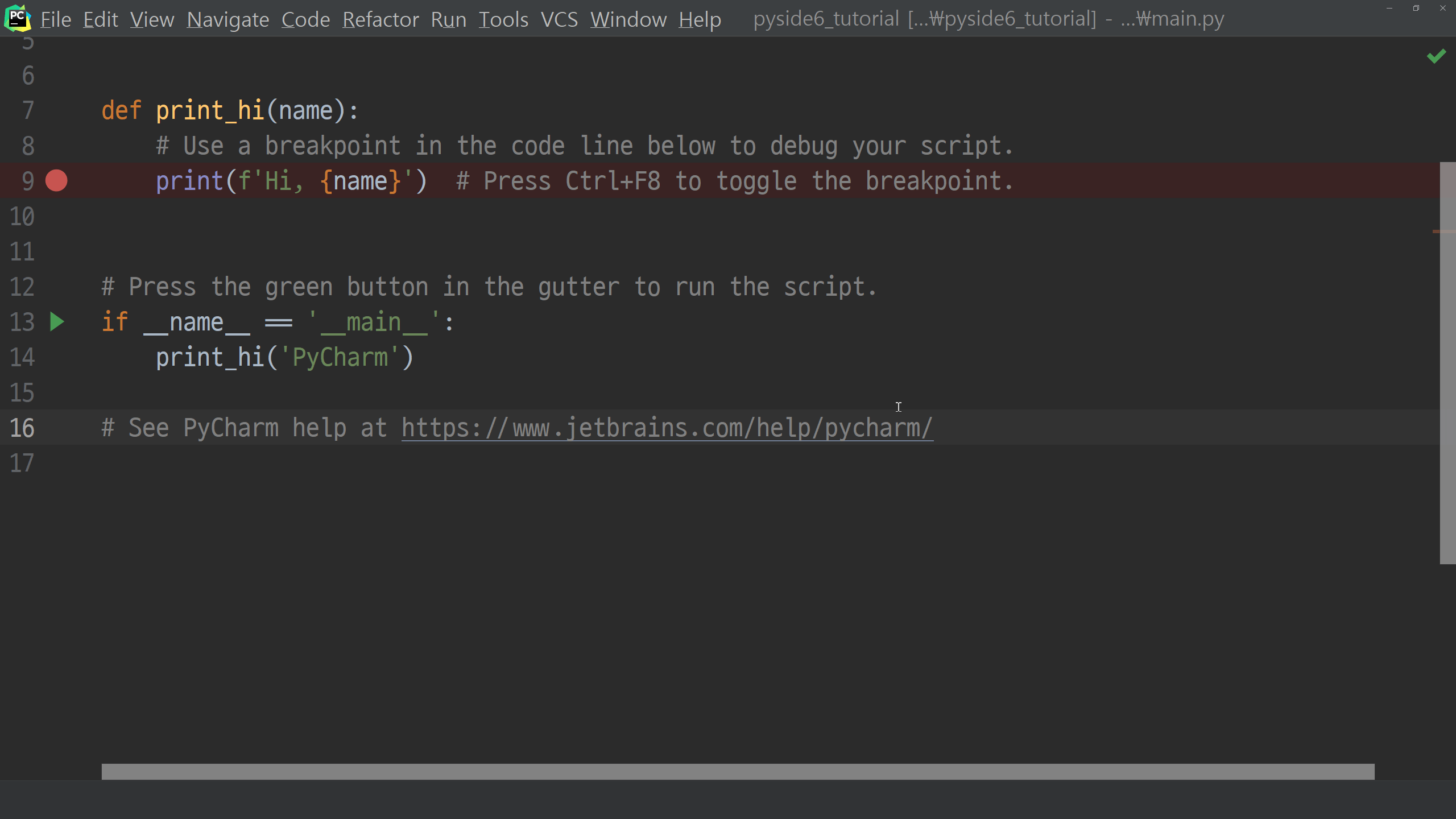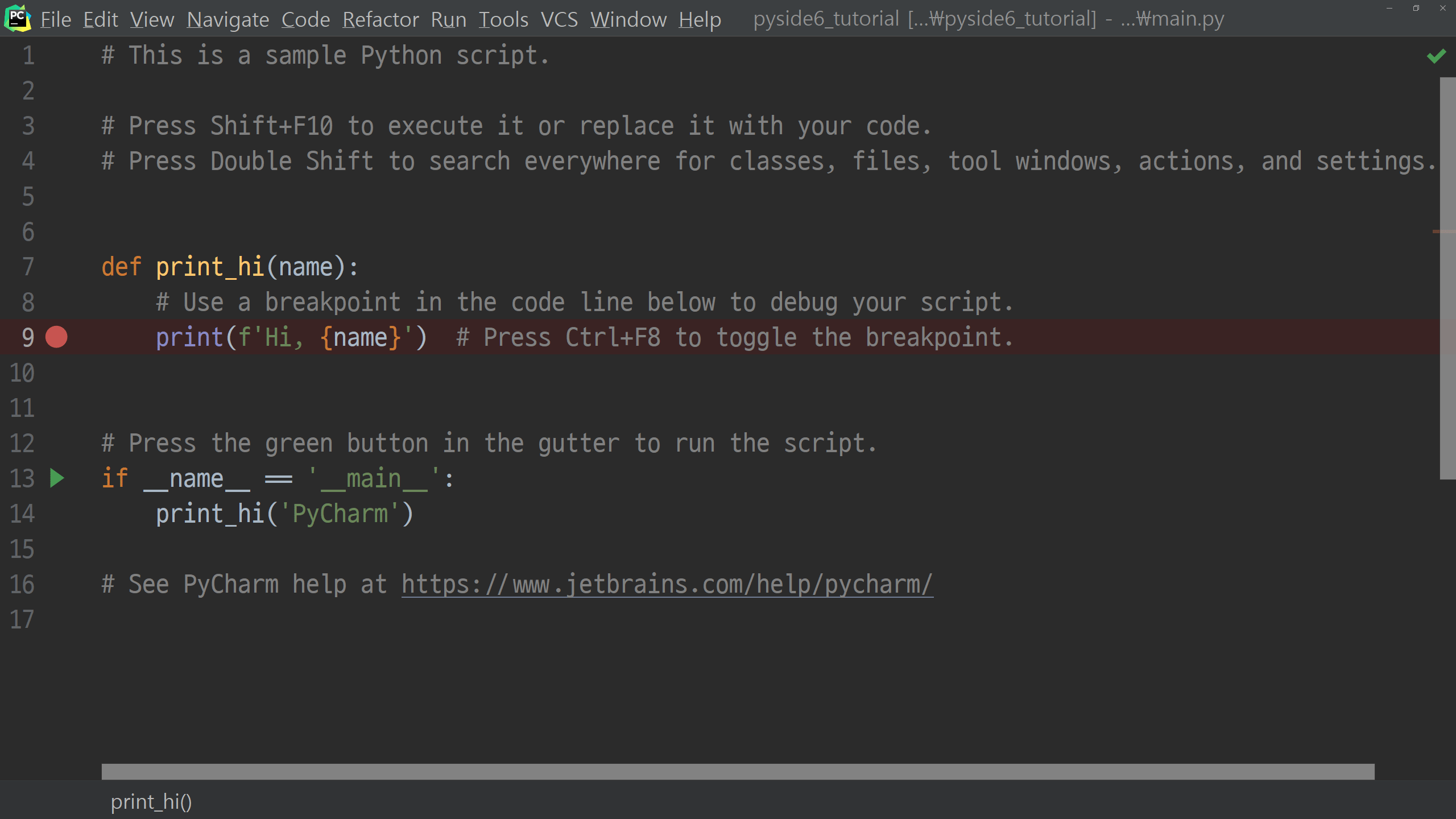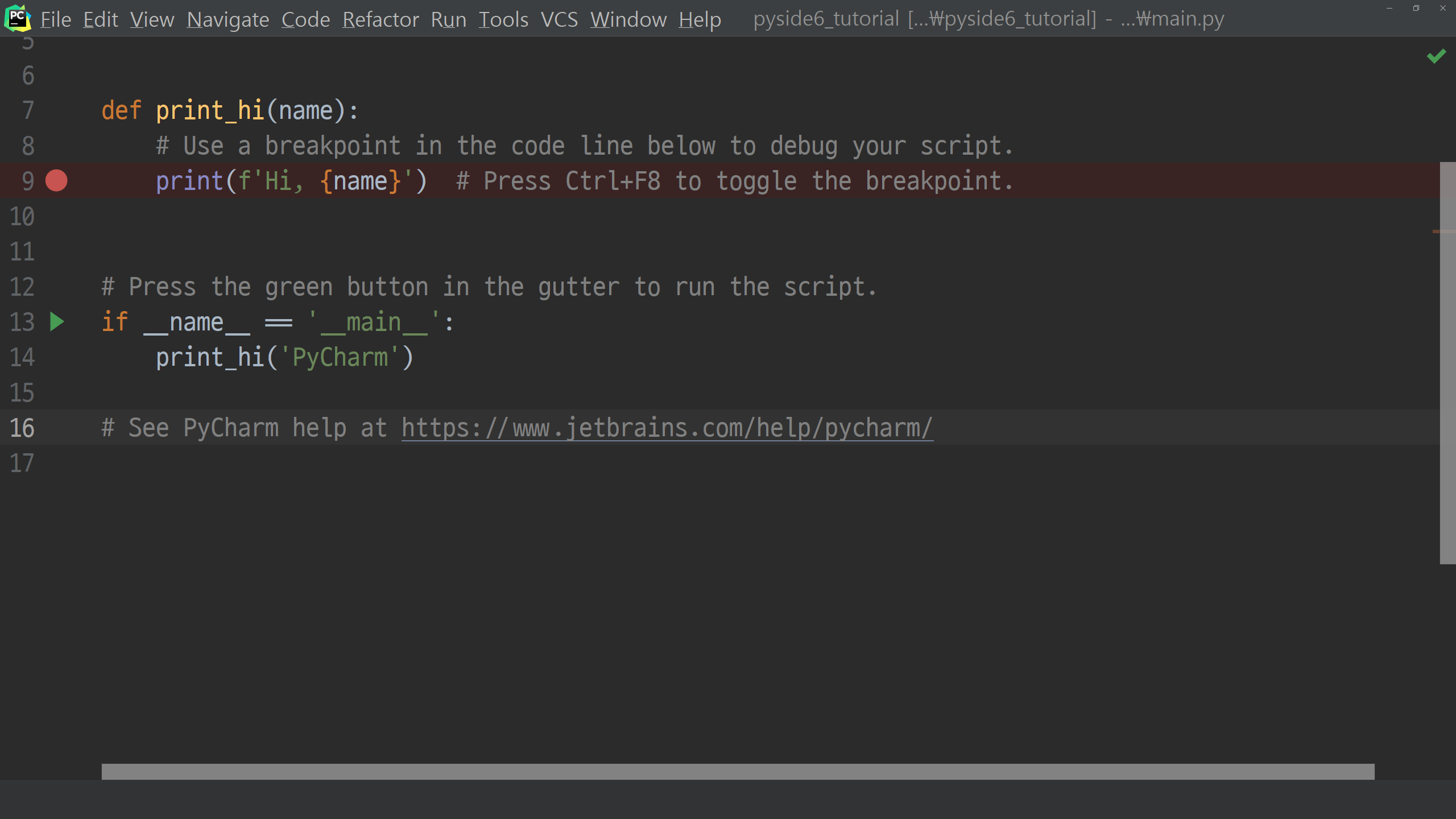 이제 PySide6의 설치를 마쳤으니 샘플코드를 한 번 실행해보고 이번 포스팅을 마칠 예정입니다. 프로젝트 루트의 main.py의 내용을 모두 지우고 아래처럼 입력해 주시기 바랍니다.