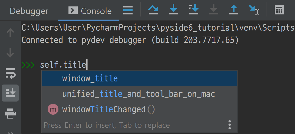 setWindowTitle("My App")의 변경된 문법이 set_window_title("My App")일 거라고 짐작하고 코드를 입력한 후 실행해보니 오류가 발생하네요. 에디터창에서 자동완성(Ctrl-Space) 기능을 써봐도, 제대로 된 메서드이름을 잡아주지 않습니다.