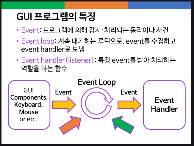 모든 Qt 프로그램은 QApplication이라는 클래스를 통해 상호작용할 수 있게 됩니다. 상호작용이란 게 거창한 게 아니라 어떤 키를 누르거나, 마우스를 클릭하고 드래그, 심지어는 마우스를 움직이기만 하는 동작 중에 프로그램이 반응할 수 있는 모든 작업들을 일컫는데요. 통상 하나의 입력작업을 편하게 "이벤트"라고 부릅시다. Qt 프로그램 안에서 이런 이벤트 정보들이 이벤트대기열, 즉 이벤트큐라는 메모리공간에 차곡차곡 쌓입니다. 그러면 QApplication이 계속해서 이벤트큐를 모니터링하다가 그 안에 처리되지 않은 이벤트가 있으면 순차적으로 처리합니다. 처리라는 게 거창한 게 아니고, 이벤트 종류별로 담당하는 각각의 매니저 같은 함수들을 보통 이벤트핸들러(혹은 listener)라고 부릅니다. 이벤트핸들러가 이벤트를 접수하고, 이벤트에 따른 상호작용의 결과를 내보내게 합니다. 이 때 프로그램이 반응하는 거죠. 그리고 이 때 일반적으로 한 개의 이벤트핸들러가 특정이벤트를 처리하기 위해 움직이는 동안 QApplication은 잠시 멈춰 있게 돼요. "작업이 완료되었습니다"라면서 이벤트핸들러가 작업을 마치는 시점에, 쉬고 있던 QApplication이 다시 모니터링을 시작하고, 이벤트 정보를 순차적으로 전달하는 일을 계속합니다. 이런 일련의 반복과정을 유식한 말로 이벤트루프(event loop)라고 부릅니다. 아주 빠르게 진행되기 때문에 동시작업 같아 보이지만 지극히 순차적으로 진행됩니다. 그리고 이와 관련하여 몇가지 룰이 있는데, 보통은 프로그램이 꼬이지 않게 하기 위해 이벤트루프를 Qt 프로그램당 하나씩만 둡니다. 이 말은 무조건 한 개의 이벤트핸들러만 움직일 수 있다(has control)는 뜻이기도 합니다. QApplication이 바로 이 이벤트루프를 담당하는 클래스입니다. 작업반장 같은 놈이예요.