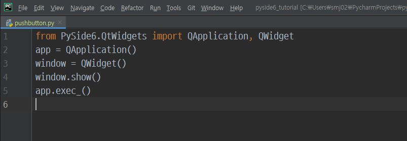 파이참으로 위 코드의 QWidget을 QPushButton으로 바꿔보겠습니다.