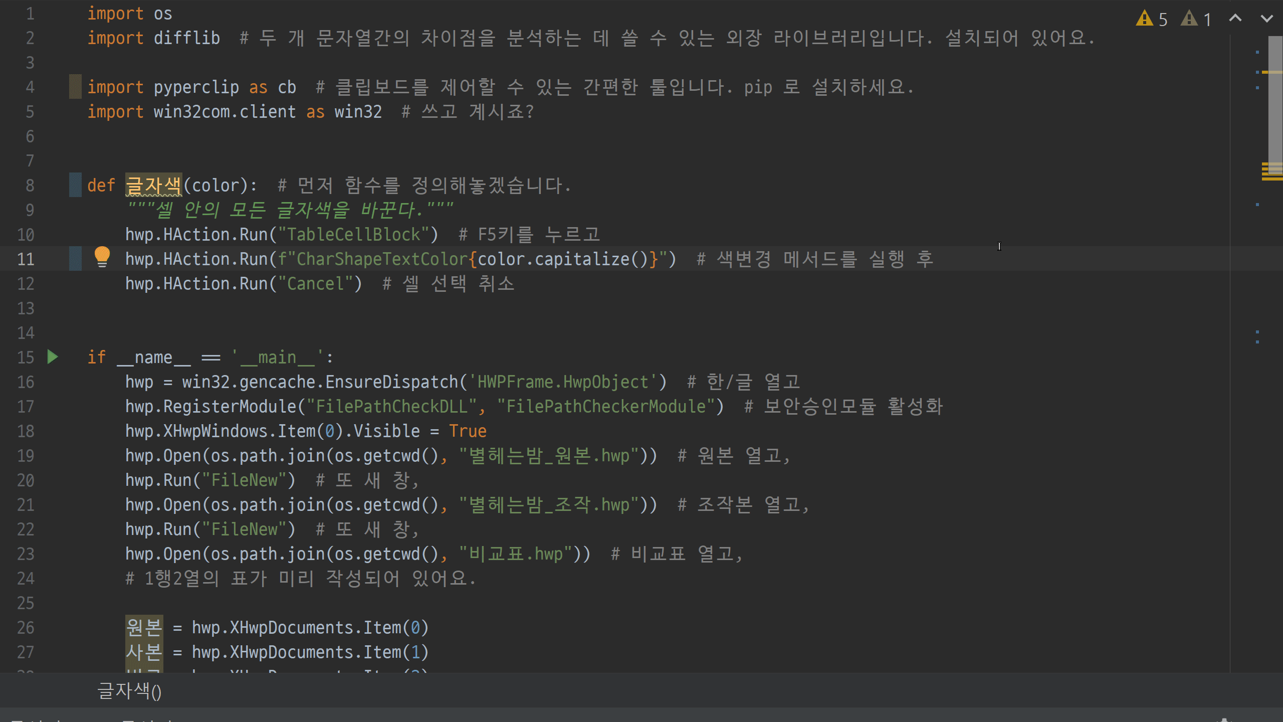 hwp.SaveAs(os.path.join(os.environ["USERPROFILE"], "desktop", "최종본.hwp")) # 바탕화면에 최종 비교표를 저장함.