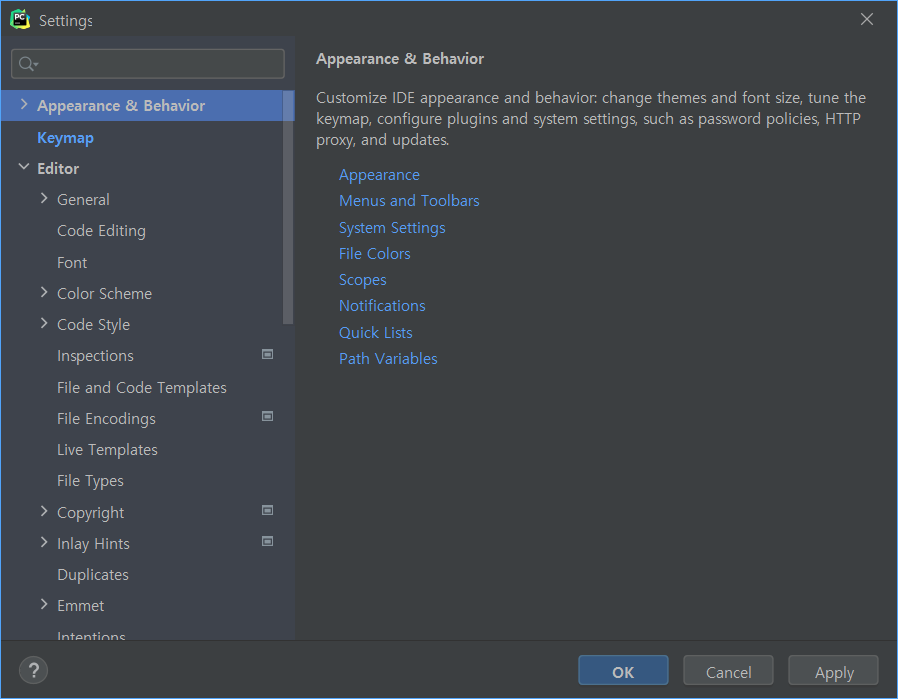 1. Ctrl-Alt-S를 눌러 Setting창을 엽니다.
