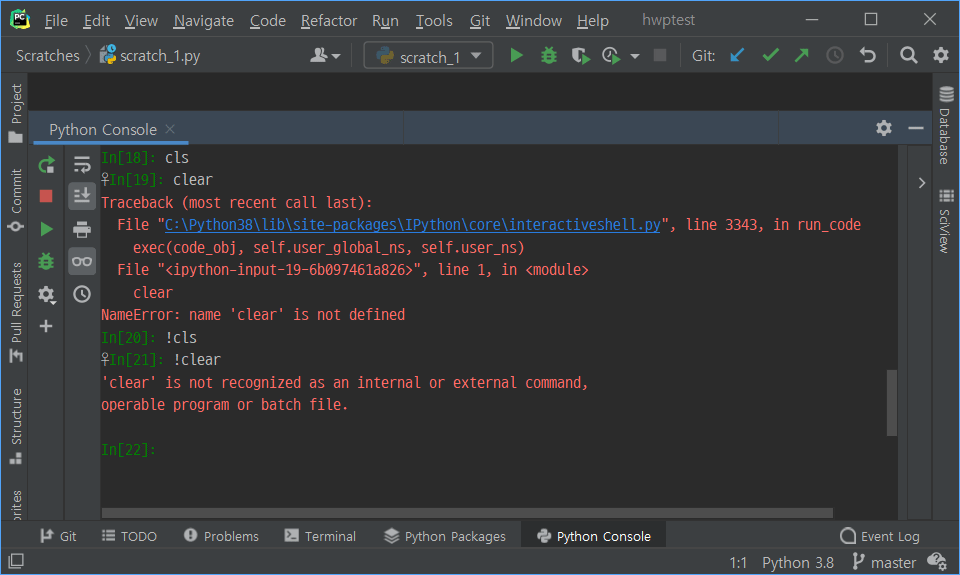 참고1) 파이참 터미널에서 ipython을 입력해서 콘솔을 실행한 경우에는 cls가 원활하게 작동합니다.