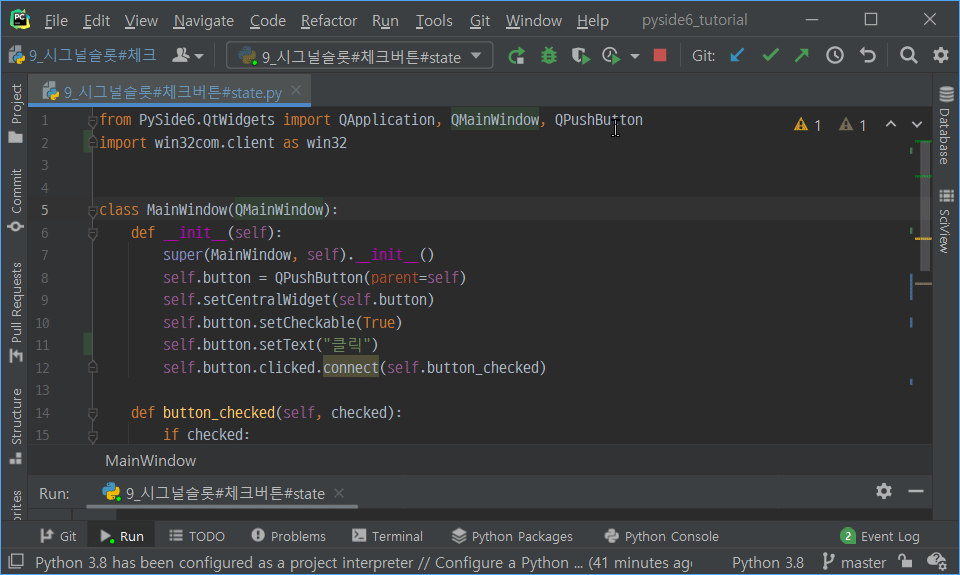5. (중요) 버튼을 클릭하는 시그널을 self.button_checked라는 슬롯(메서드)와 연결하기