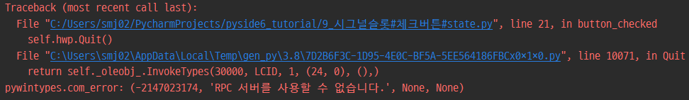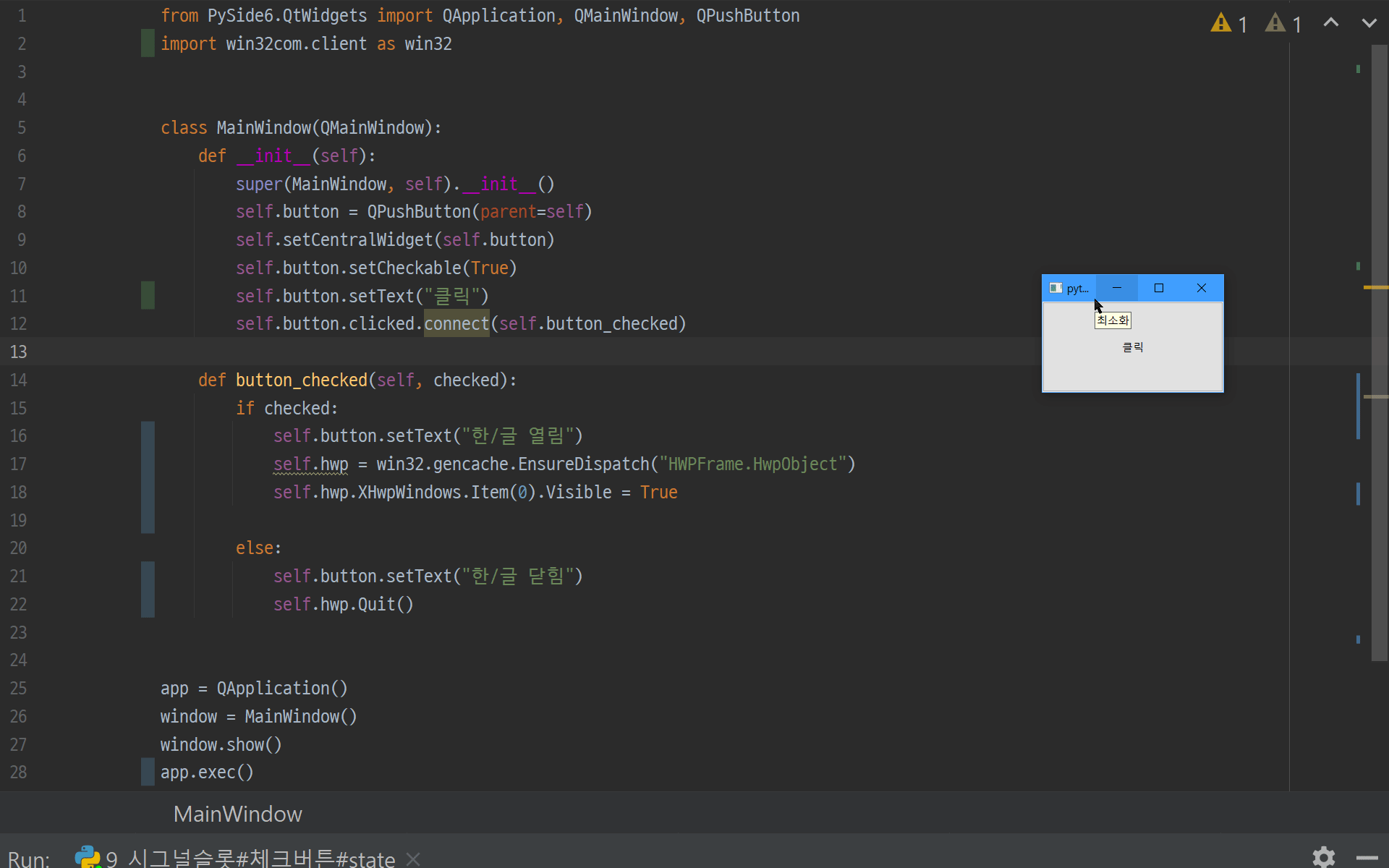 윗줄은 PySide6 관련 임포트, 아랫줄은 한/글을 열기 위한 win32com모듈 임포트입니다.