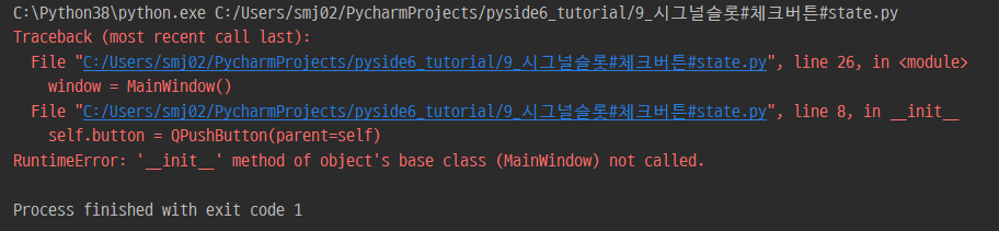 "MainWindow 오브젝트의 베이스클래스의 __init__ 메서드가 호출되지 않았다"는 메시지가 뜨네요..