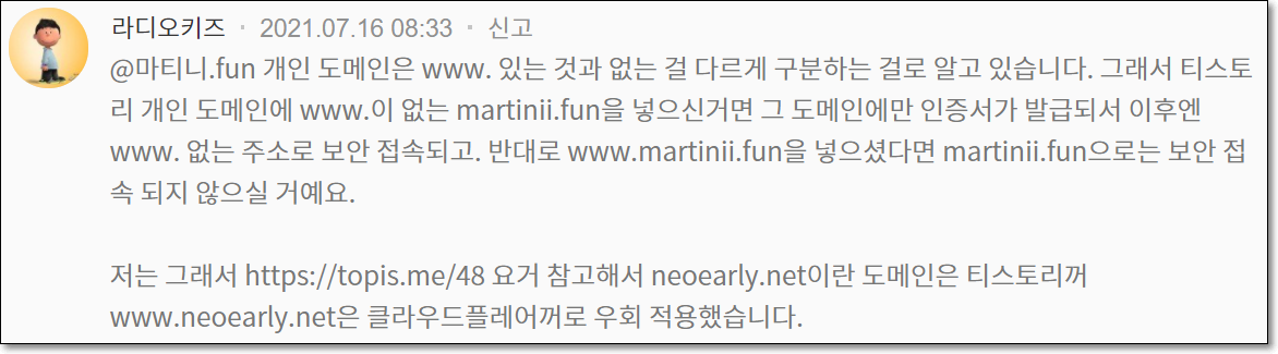 예. 솔직히 저는 저게 무슨 말인지 잘 모릅니다. 막연하지만, 하나씩 더 제공해줄 때 돈이 많이 들어서 그런가 생각해 보면 얕은 검색결과 그건 또 아닌 것 같습니다. 하여튼 며칠 전부터 저 사실 때문에 제 블로그에 접속할 때 https://martinii.fun 은 접속이 되기 시작했고, 잘 작동하던 https://www.martinii.fun 은 인증서 오류와, 신용카드 정보를 빼간다 어쩐다 하는 무시무시한 경고문구가 뜨면서 접속이 되지 않았습니다.