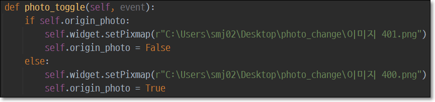 상단의 메인윈도우 생성자(__init__)에서 self에 origin_photo라는 bool 변수를 정의해놓았습니다. 원래사진이면 origin_photo == True, 바뀐 사진이면 False로 써두고, origin_photo 상태에 따라서 다른 사진을 불러오려고 합니다. 코드 자체는 간단하죠? 맨 윗줄 괄호 안에 (self, event): 라고 인자가 두 개 들어있습니다. 이건 mousePressEvent가 두 개의 인자를 받아야 하는 메서드이기 때문입니다. (실제로 photo_toggle 함수 어디에도 event 파라미터를 사용하지는 않았습니다.)