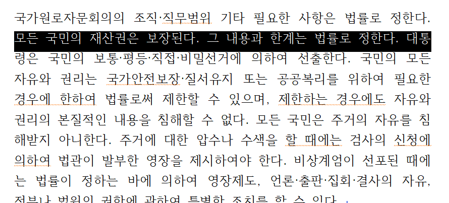"모든 국민의 재산권은 보장된다. 그 내용과 한계는 법률로 정한다. 대통"