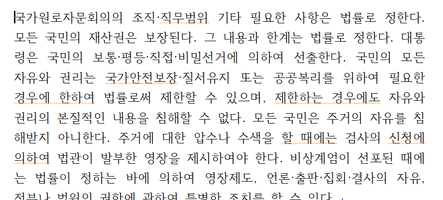 국가원로자문회의의 조직·직무범위 기타 필요한 사항은 법률로 정한다. 모든 국민의 재산권은 보장된다. 그 내용과 한계는 법률로 정한다. 대통령은 국민의 보통·평등·직접·비밀선거에 의하여 선출한다. 국민의 모든 자유와 권리는 국가안전보장·질서유지 또는 공공복리를 위하여 필요한 경우에 한하여 법률로써 제한할 수 있으며, 제한하는 경우에도 자유와 권리의 본질적인 내용을 침해할 수 없다. 모든 국민은 주거의 자유를 침해받지 아니한다. 주거에 대한 압수나 수색을 할 때에는 검사의 신청에 의하여 법관이 발부한 영장을 제시하여야 한다. 비상계엄이 선포된 때에는 법률이 정하는 바에 의하여 영장제도, 언론·출판·집회·결사의 자유, 정부나 법원의 권한에 관하여 특별한 조치를 할 수 있다.