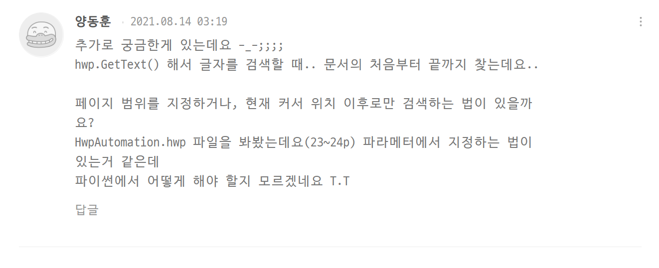 # 5페이지로 이동 target_page = 5 hwp.HAction.Run("MoveDocBegin") # 문서 시작으로 이동 for _ in range(target_page-1): hwp.HAction.Run("MovePageDown") # 문서 시작으로 이동 # 5~10페이지 탐색 current page = hwp.KeyIndicator()[3] hwp.InitScan(option=0, Range=0x22) while current_page <= 10: text = GetText() # 탐색실시 if text[0] in (0, 1): # 문서끝에 도달한 경우 break # while문 종료 hwp.SetPos(201) # MoveScanPos : GetText() 탐색위치로 커서 이동 current page = hwp.KeyIndicator()[3] # 현재 쪽번호 print(text[1]) # text[1]로 자유롭게 작업 실시