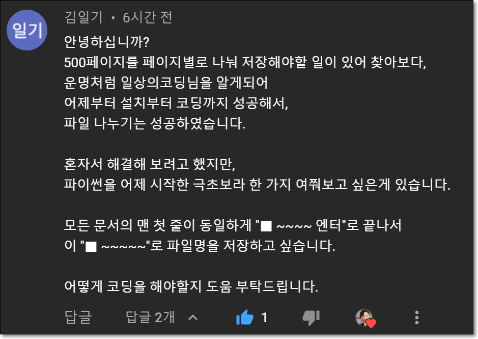 안녕하세요? 일상의 코딩, 일코입니다. 두 번째 시간입니다. 지난 시간에는 한/글을 열지 않고도 첫 줄을 불러오는 함수를 소개해드렸습니다. def 첫줄읽기(filepath): """한/글 문서 텍스트를 불러와
