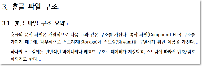 정확히는 한/글 2002 이후 문서의 구조가 그렇다는 것입니다. 한/글 3.0 등 이전 버전 문서의 포맷은 다소 다릅니다.