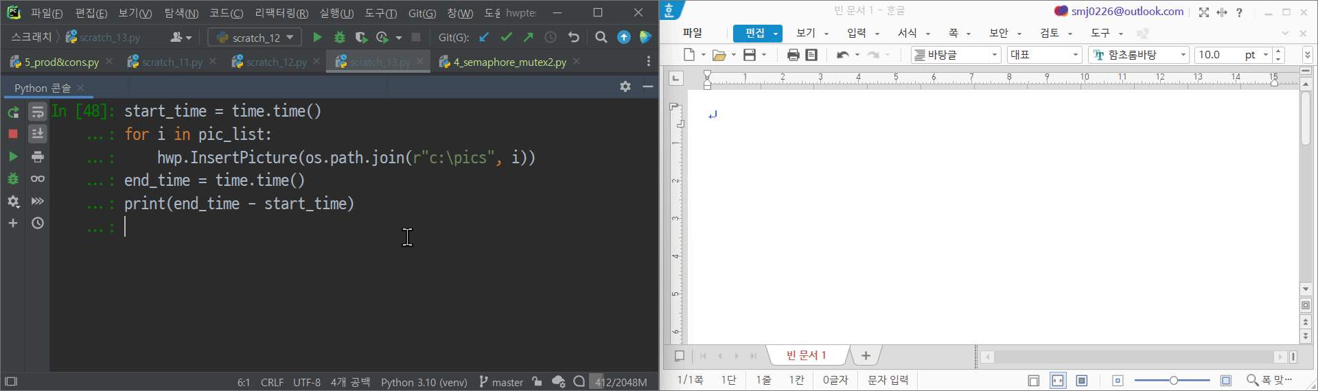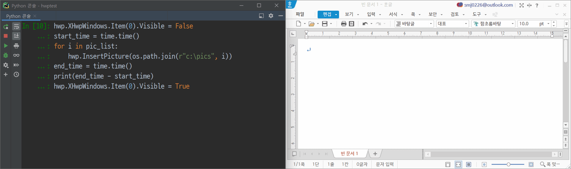 이렇게 한/글 창을 숨기고 코드를 실행하는 게 훨씬 속도가 빠릅니다.