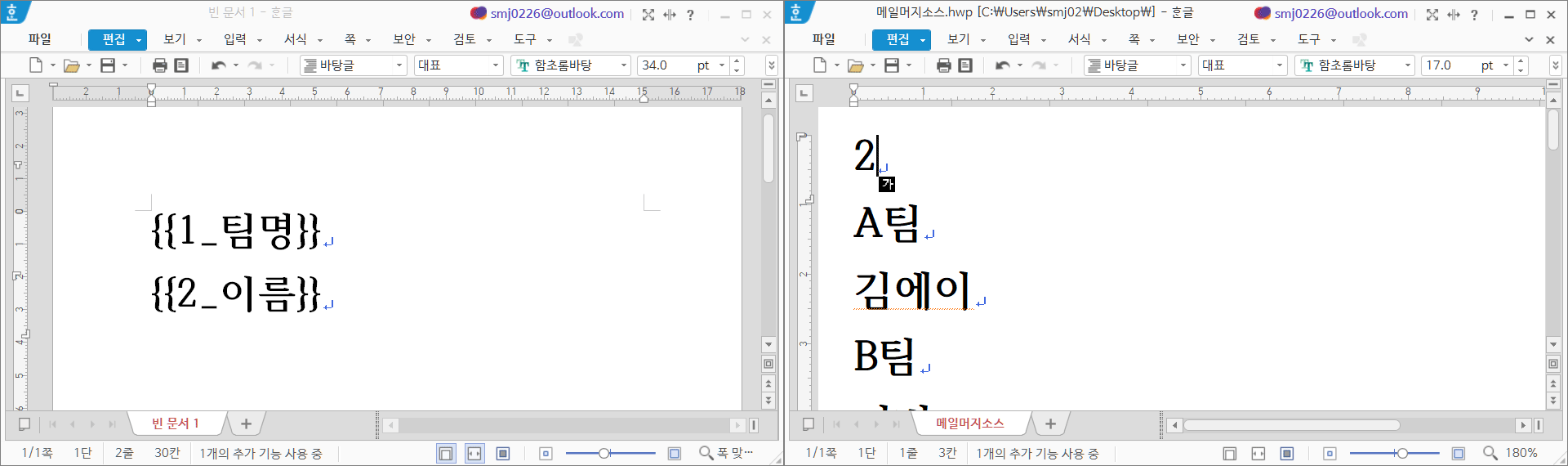 (엑셀파일이 아닌) 한/글 문서를 메일머지 소스로 사용하기 위해서는