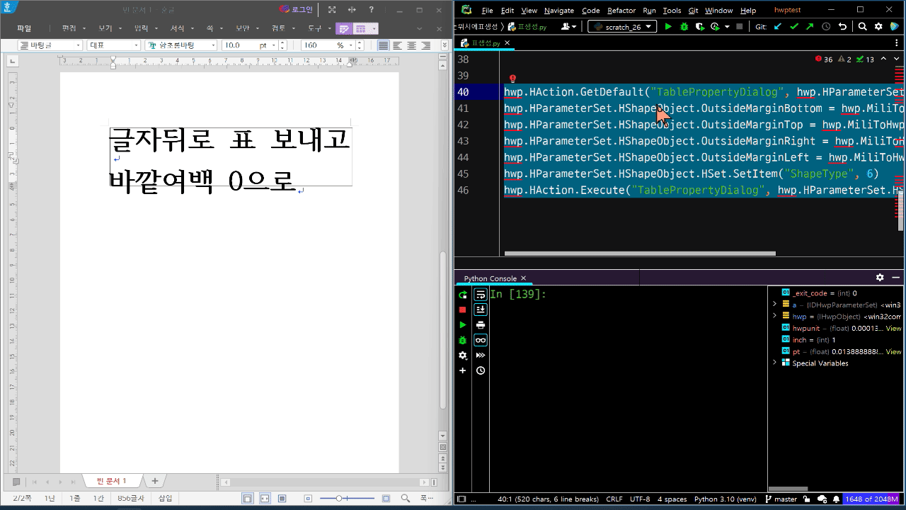 hwp.HParameterSet.HTableCreation.TableProperties.TreatAsChar = 1 # 글자처럼 취급