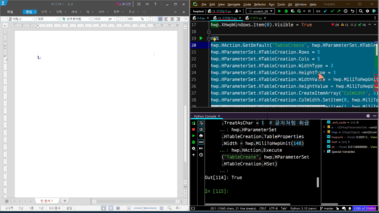hwp.HAction.Execute("TableCreate", hwp.HParameterSet.HTableCreation.HSet)