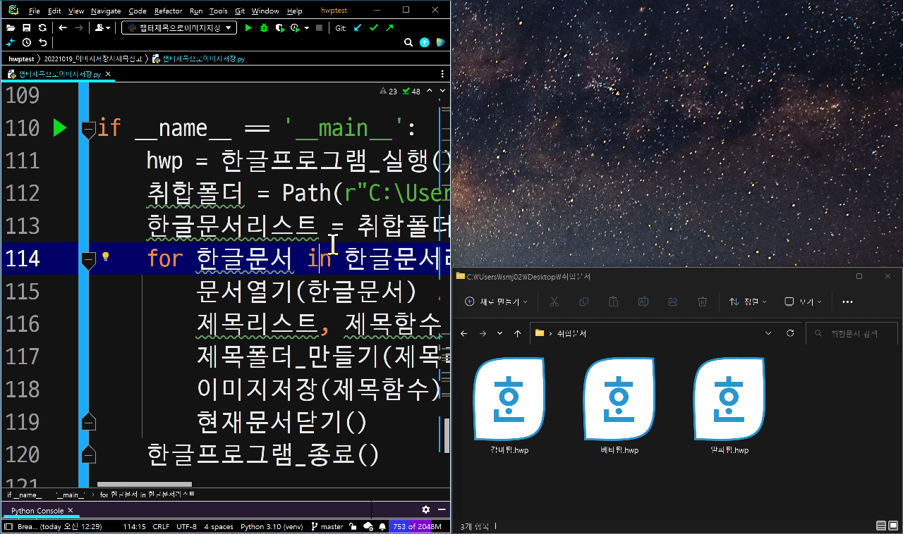 메인함수 if __name__ == '__main__': hwp = 한글프로그램_실행() 취합폴더 = Path(r"C:\Users\smj02\Desktop\취합문서") 한글문서리스트 = 취합폴더.glob("*.hwp") for 한글문서 in 한글문서리스트: 문서열기(한..