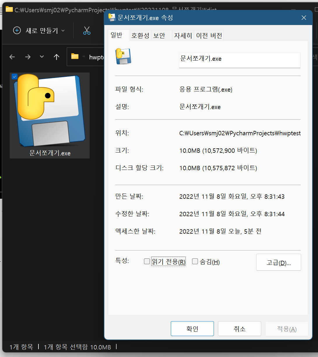 파이썬과 pywin32모듈 등이 모두 포함되어 있어 용량이 10메가 정도가 되었네요.