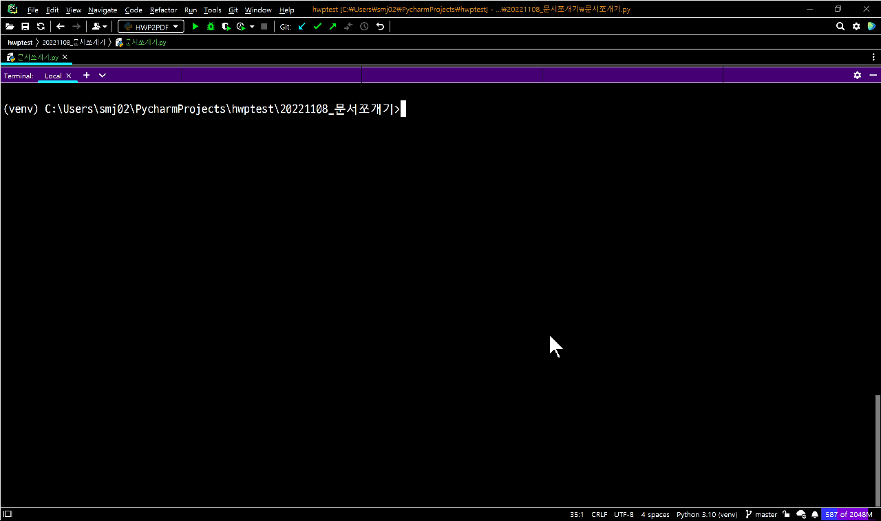 위 코드를 파이참으로 한 번 실행해보겠습니다.