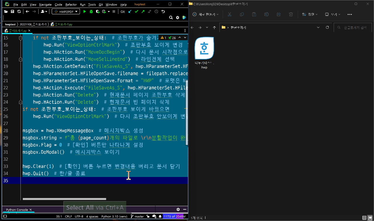 이번 포스팅에서는 파이썬으로 한/글 문서를 직접 한 쪽씩 잘라내서 따로 저장하는 프로그램을 만들어보겠습니다.