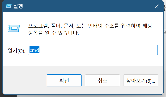 윈도우키+R을 눌러서 좌측하단 실행창을 연 후에 "cmd"를 입력하고 엔터를 칩니다.