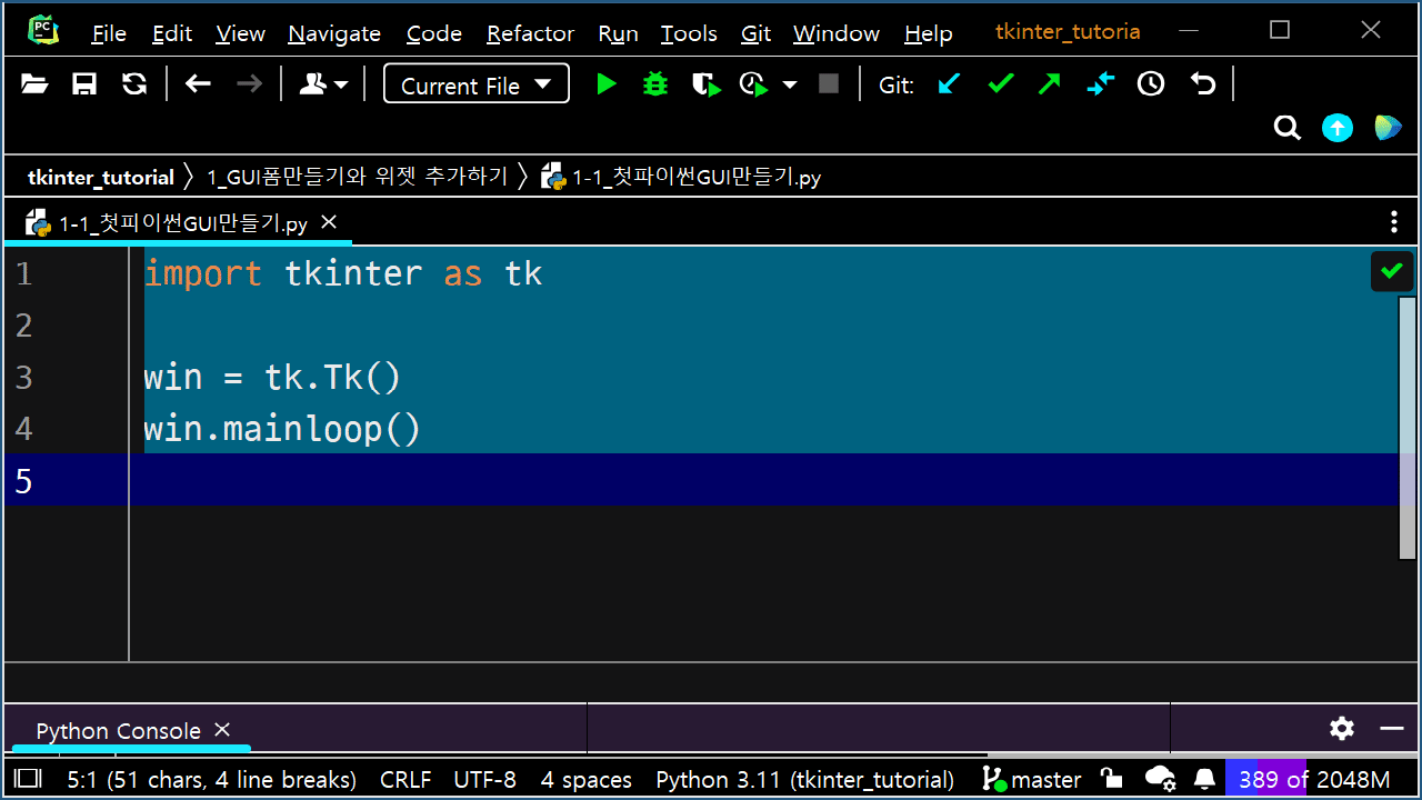 2022.11.15 - [기타/tkinter 한꼬집씩만 따라해보기] - 2. 빈 창에 타이틀 붙이기