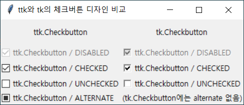 tk.Checkbutton과 ttk.Checkbutton은 서로 디자인이 다릅니다. (ttk가 좀 더 플랫하고, 모던해 보입니다.)