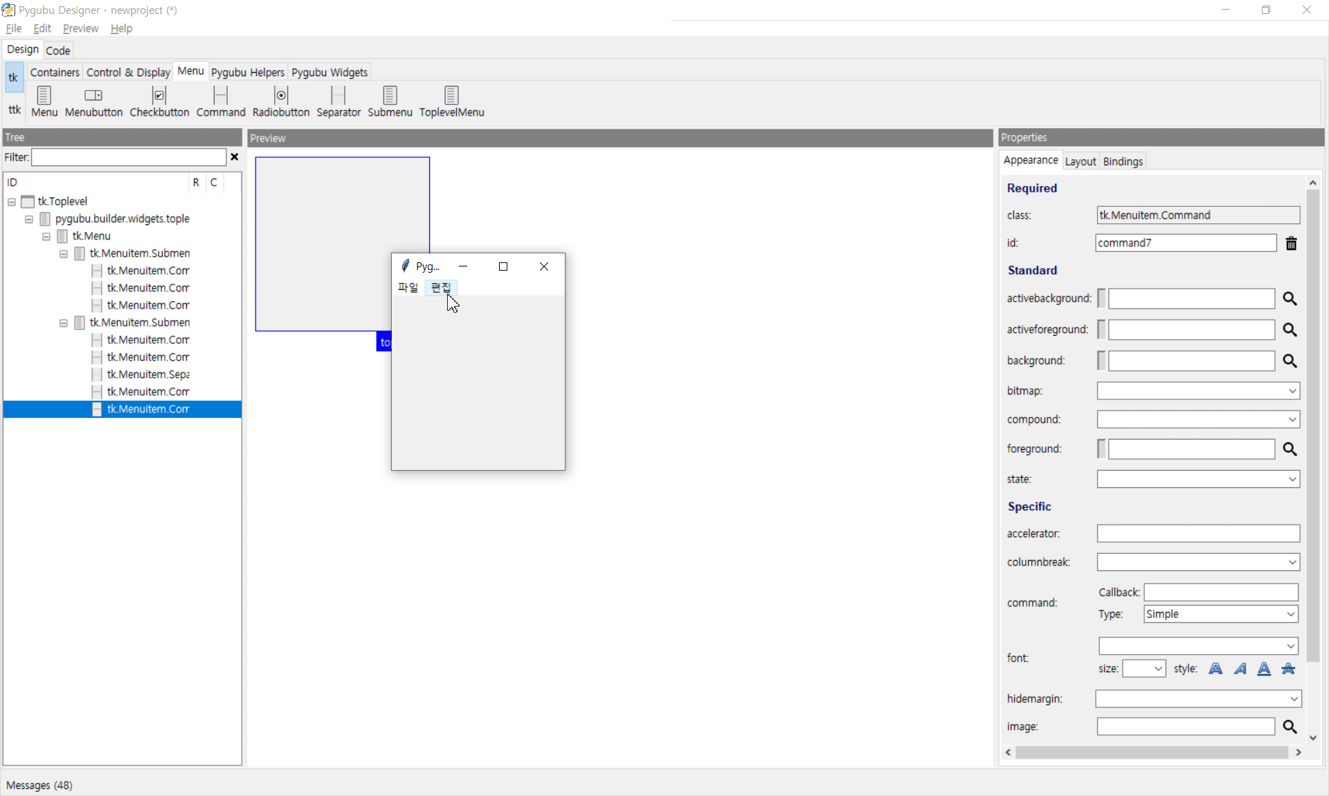 pygubu designer로 메뉴바를 만드는 과정 일부를 짧게 한 번 보여드리겠습니다.