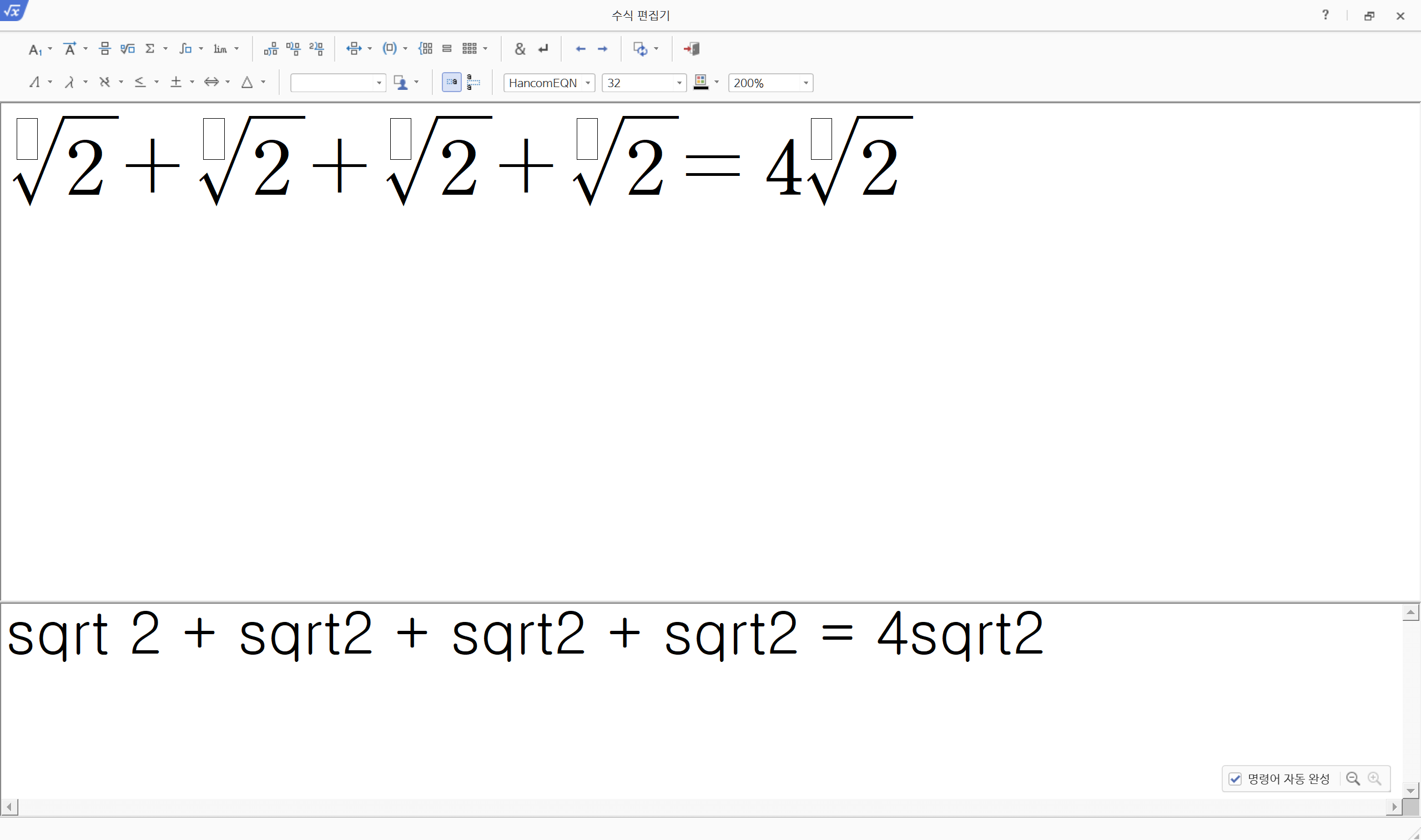 직접 스크립트 문법을 작성하여 입력하는 경우 sqrt {2} 또는 sqrt 2 이런식으로 표현이 가능합니다.
