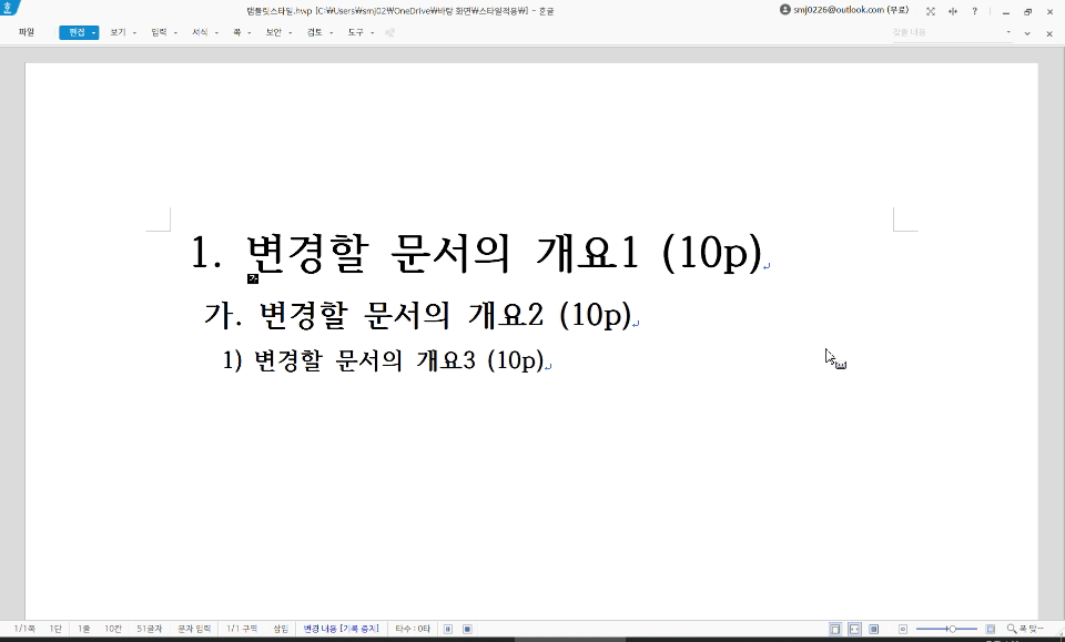 기본 스타일에서 서체 크기만 조정된 상태입니다. 개요1부터 3까지 각각 25, 18, 14p의 크기가 적용되어 있습니다.