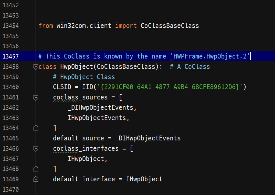 13,457번째 라인의 주석에 보면 "HWPFrame.HwpObject"라는 문자열이 있습니다.