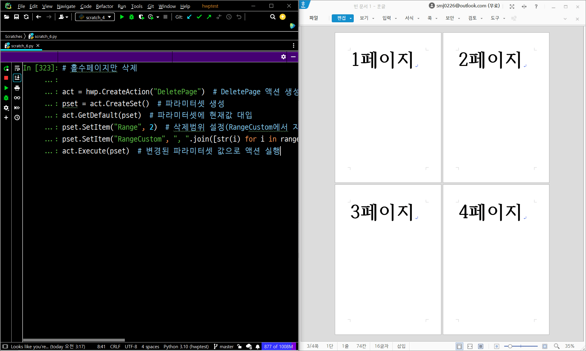 act = hwp.CreateAction("DeletePage") # DeletePage 액션 생성