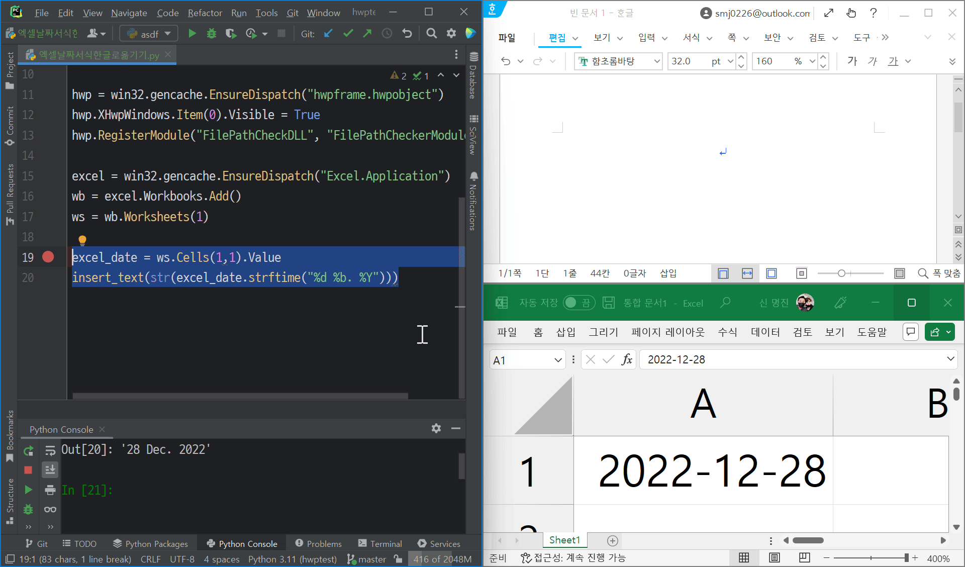 이제 아래와 같이 엑셀의 날짜 값을 한/글에 삽입하면(insert_text 함수를 정의해 두었음)