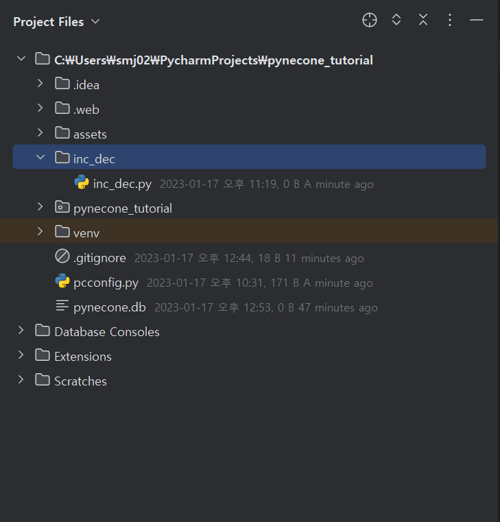 이번엔 프로젝트 루트에 "inc_dec"라는 폴더를 생성해줍시다.