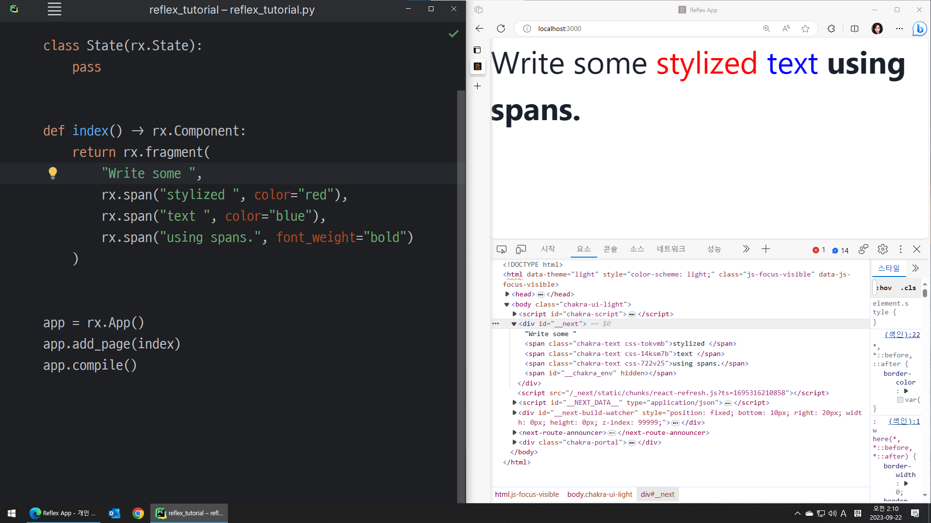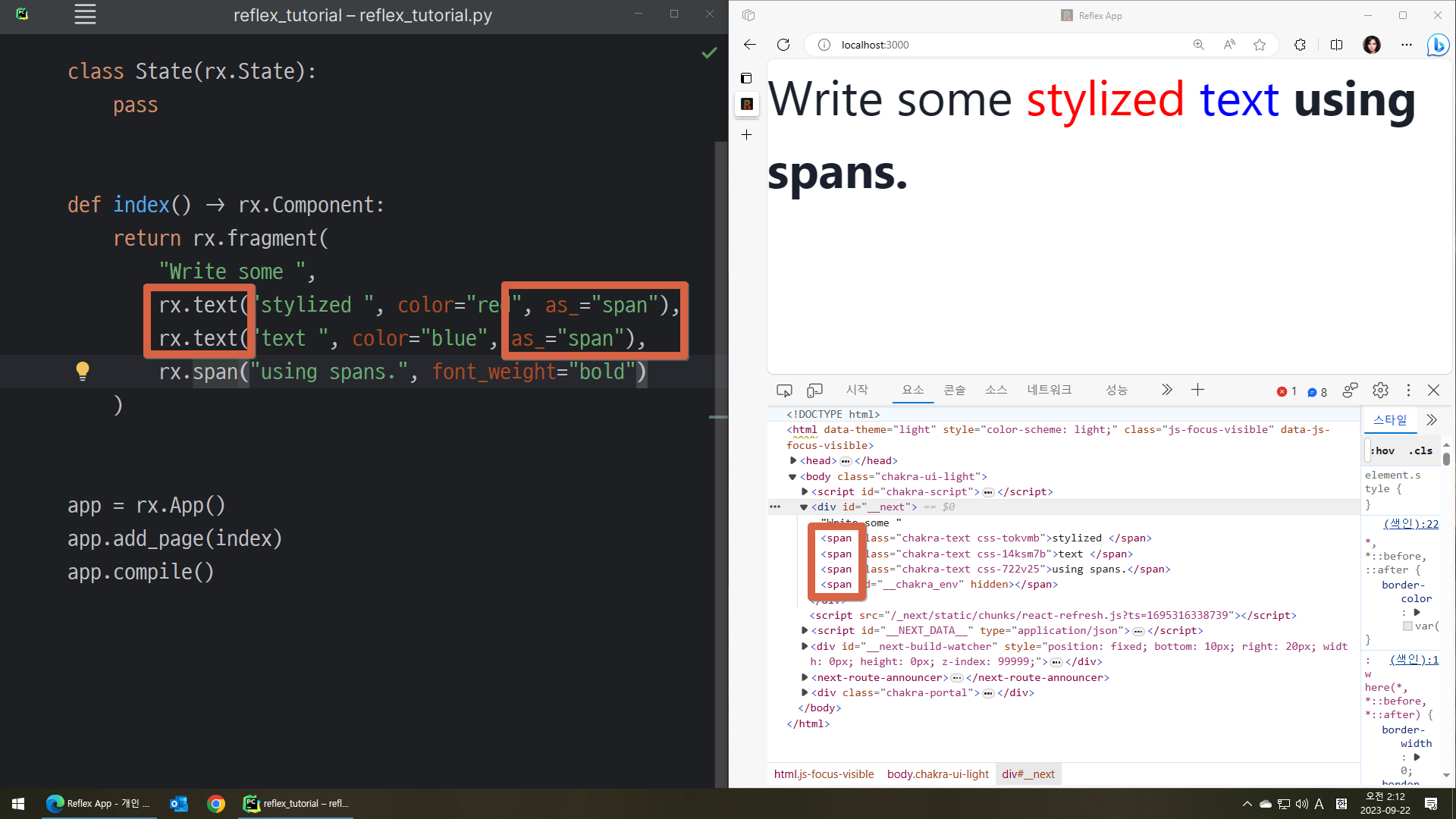 rx.span 컴포넌트는 줄바꿈을 하지 않고 라인 내 특정 텍스트에만 스타일을 적용할 수 있습니다.