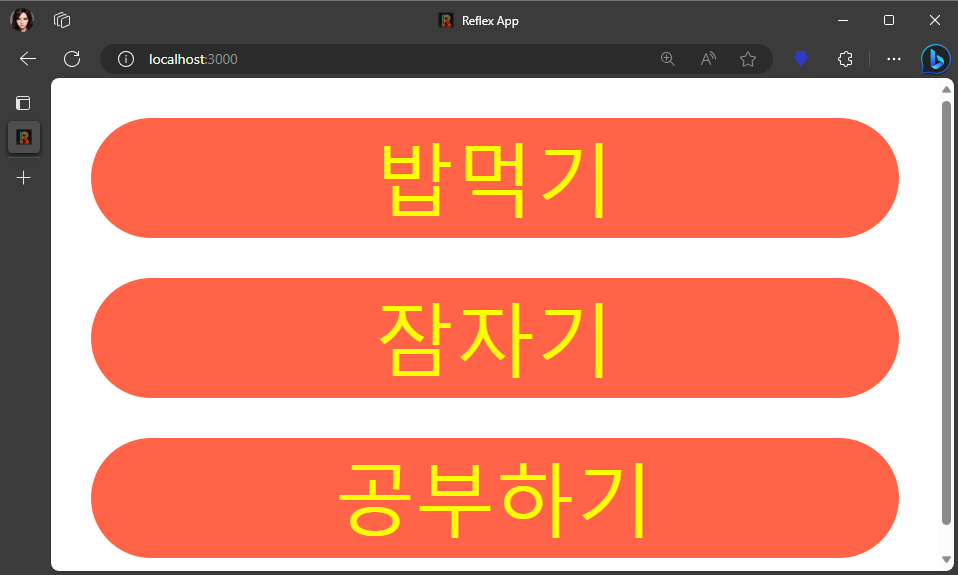 실행화면은 아래와 같다. (rx.vstack은 가운데정렬이 기본값이다.)