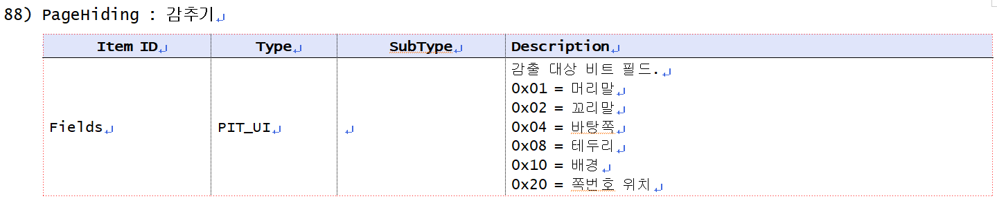 - Fields 같은 문자열은 "Item ID"라고 불러요. 위의 Action Table에서 찾은 ParameterSet ID인 "PageHiding"으로 ParameterSet Table.hwp에서 검색해보면 Item ID가 "Fields" 한 개 밖에 없네요. 사용법은 Description에 나와 있고요.