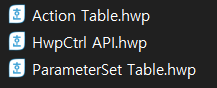 이 때 사용하는 문서가 Action Table.hwp 와 ParameterSet Table.hwp 두 개의 파일이에요.