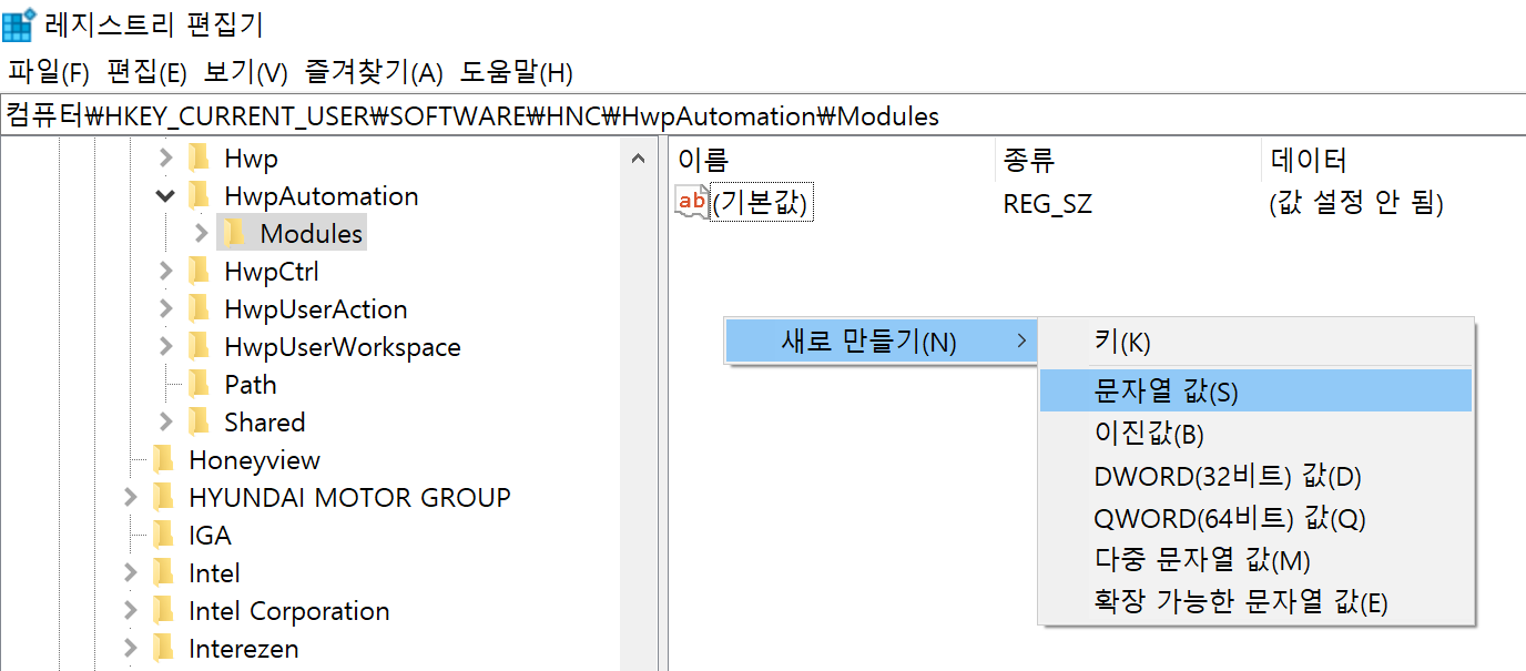 다. 아래 주소(HKEY_CURRENT_USER\SOFTWARE\HNC\HwpAutomation\Modules)로 이동합니다.