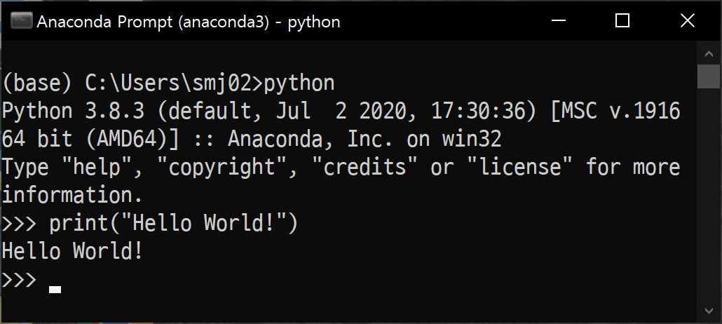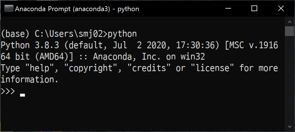 일반적인 커맨드프롬프트와는 다르게 좌측에 (base)라는 문구가 들어가 있습니다.