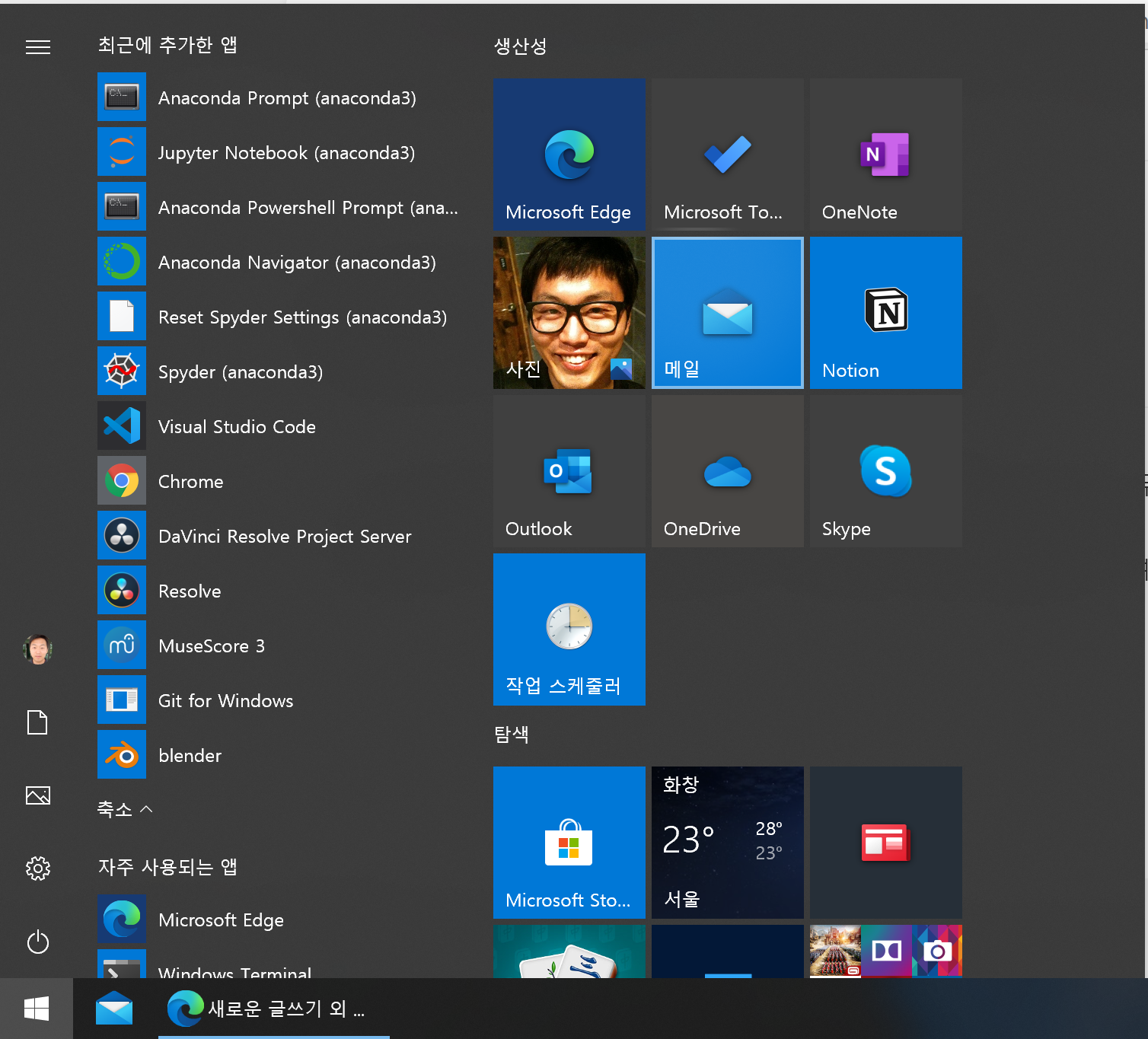 "최근에 추가한 앱"에 Anaconda Prompt, Anaconda Powershell, Jupyter Notebook, Spyder 및 Pycharm Community Edition 등 다양한 프로그램들이 추가되어 있는 것을 보실 수 있습니다.