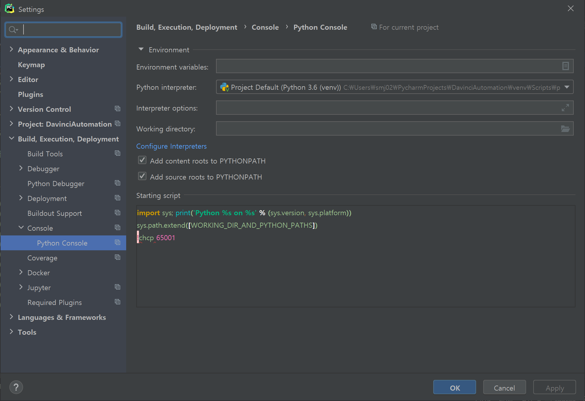이유는 간단하다. 파이썬 콘솔은 UTF-8, 콘솔에서 불러오는 터미널은 CP-949가 활성코드페이지로 설정되어 있기 때문이다. 해결 방법은 의외로 간단하다. 매번 파이썬 콘솔을 열 때마다 터미널 활성코드페이지를 65001(UTF-8)로 바꿔주는 코드를 실행하면 된다.
